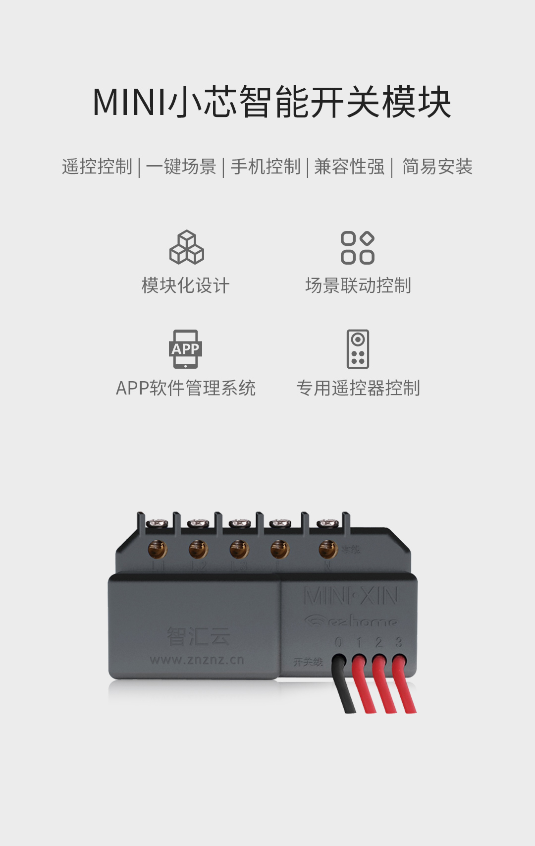 Mini小芯智能开关模块不仅可以对灯光进行智能控制,同时也可搭配电动窗帘轨道与电机,实现智能窗帘控制,2.4G小模块大作用,拓展性强。