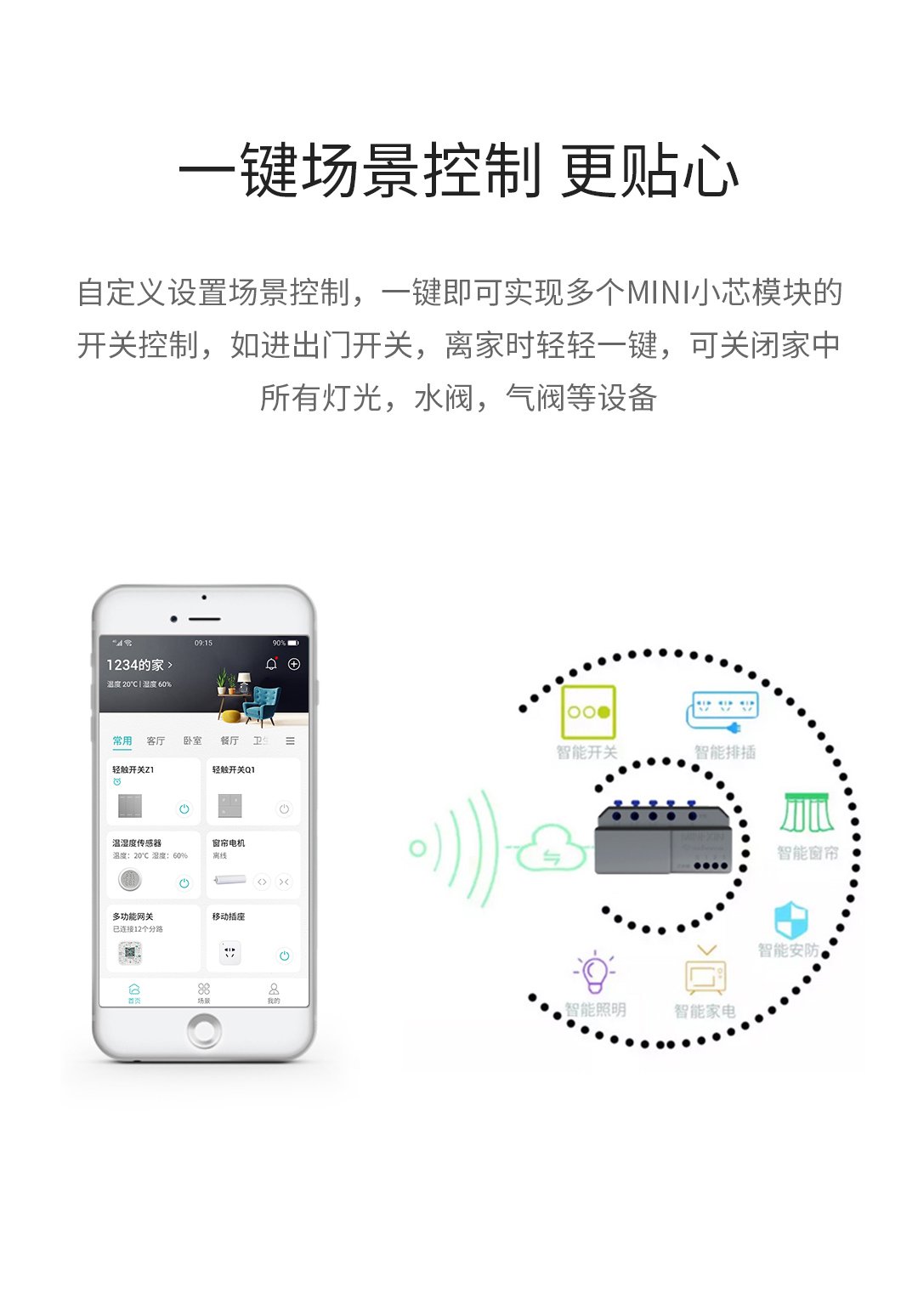 模块可自定义设置场景模式,一键即可实现多个Mini小芯模块的开关控制,设置你日常生活模式,如离家、归家、睡眠模式,仅需在场景面板上一键开关,便可同时关闭家中所有灯光、窗帘、水阀电阀等,达到您想要的生活场景。