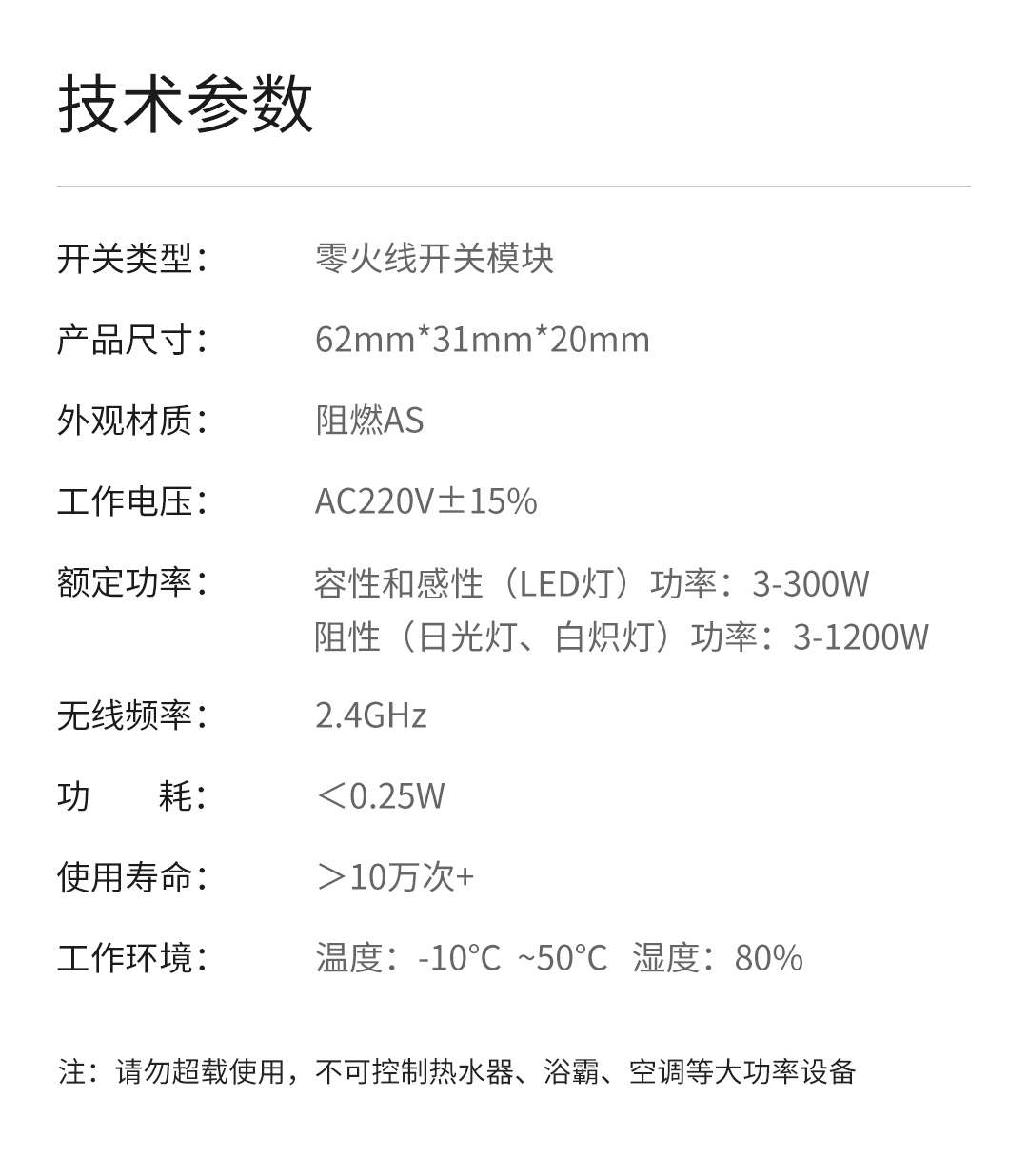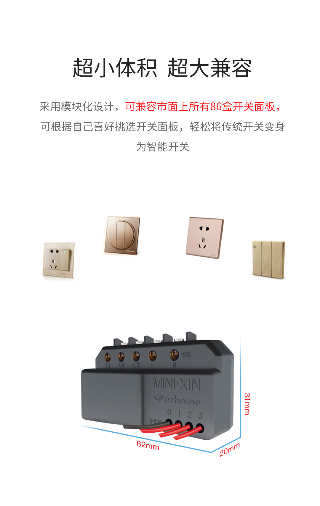 1.采用模块化设计,尺寸60mm*20mm*31mm,可兼容市面上所有品牌开关
