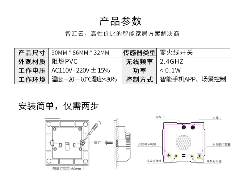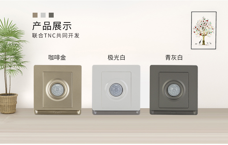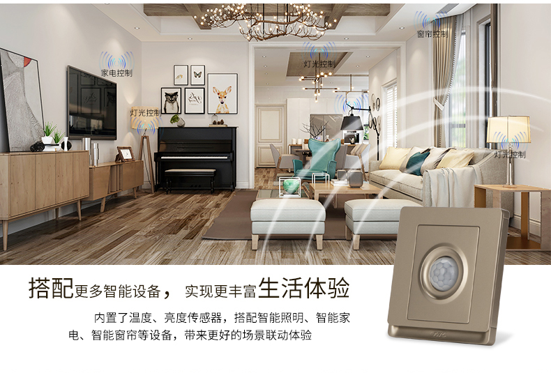 三合一传感器内置了温度、亮度、移动检测3个传感器,可根据灯光的明暗、温度的高低、是否有人来判断是否执行开关灯、开空调、开窗帘等