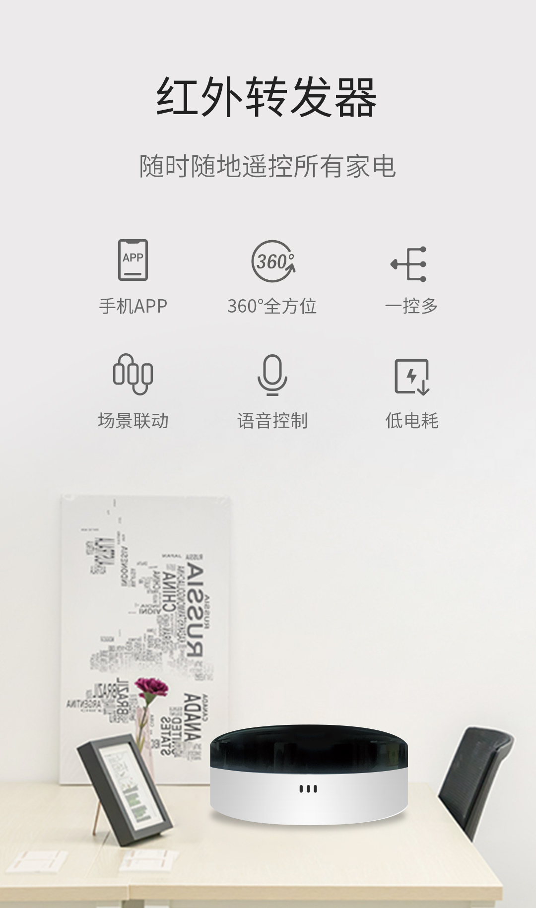 不需任何设备,只需要一个红外转化器即可实现家电控制,外出路上,能提前用手机APP打开家中空调,也可以支持语音,遥控控制。