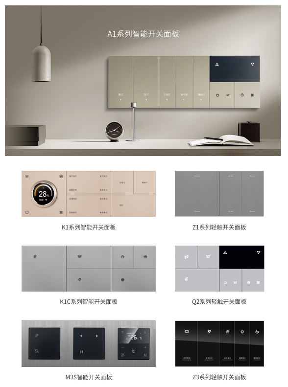 3499拉斯维加斯智能开关采用EZ-Net无线智能方案,拥有阻燃PC/AG玻璃/太空铝等多种材质面板,配色丰富,款式多样,适配风格多元化的不同家居装修风格。