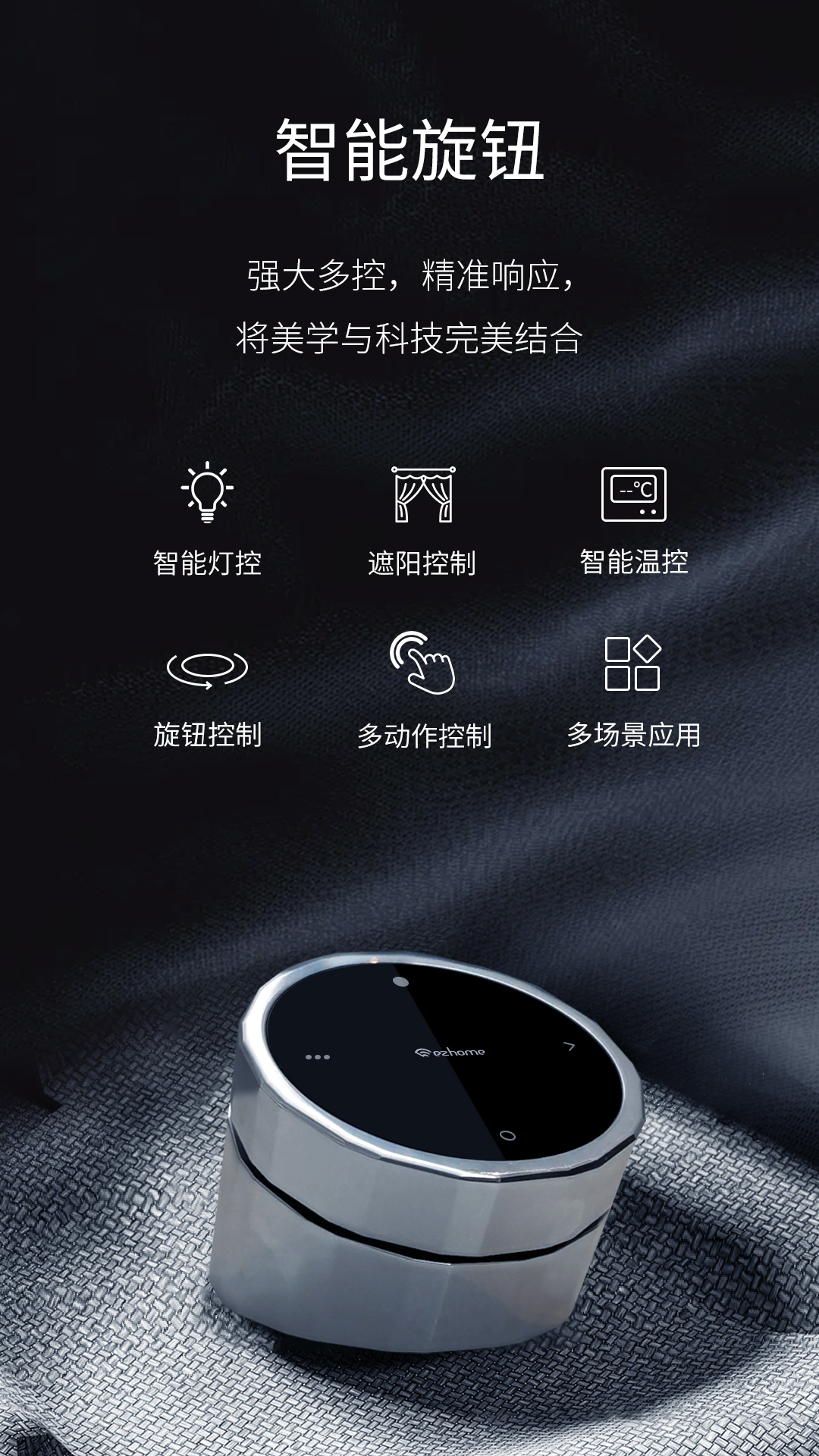 新品智能旋钮不仅可以0%-100%的无极旋钮控制调节,还可以单击、双击、旋转等方式进行控制,一个旋钮即可解决全屋灯光控制。