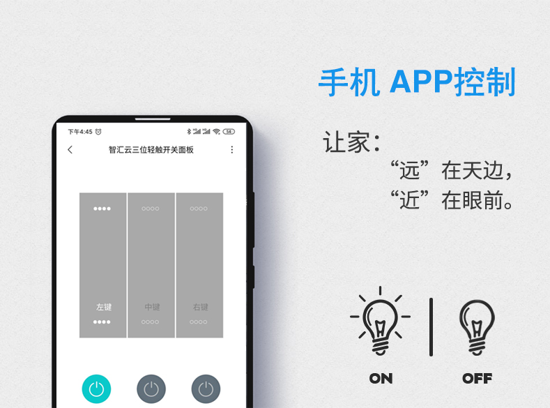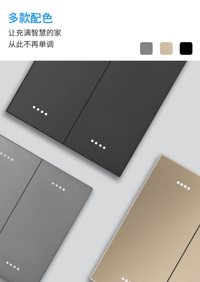 智能情景面板 在触摸开关的基础上衍生而来,支持一键触发多种智能设备开、关及DIY各种情景模式,充分满足了用户的多控需求。智能情景面板采用标准86盒设计,完全兼容传统照明开关面板,可直接替换;低功耗,安全绿色环保。