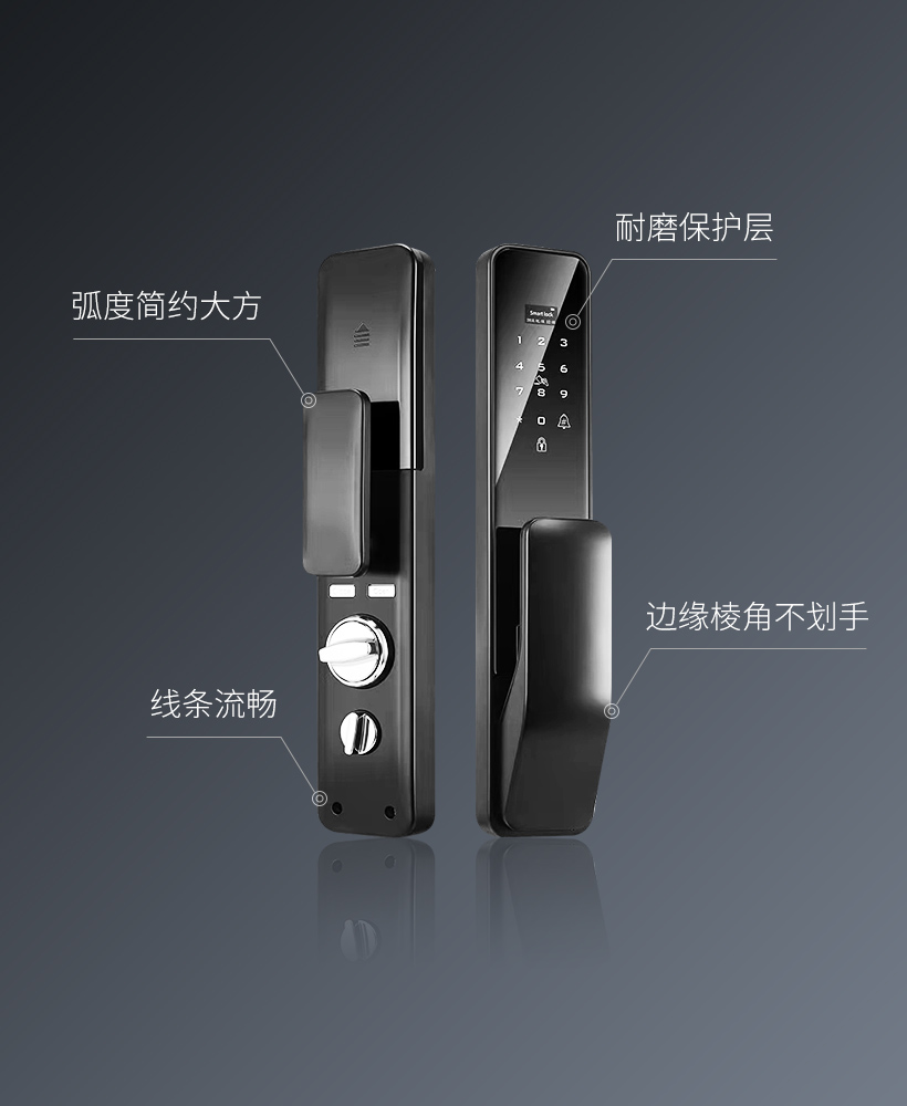 将原本枯燥的五金产品门锁打造成令人悦目的电子产品。在外观方面,简约大方优雅的弧度以及流畅的线条,带来一种强烈的视觉延伸感;在铸造工艺方面,覆上了一层耐磨的保护层,使得门锁颜色能够长期保持不易褪色,边缘棱角等细节不划手,不论是观感还是触感都带有极佳的体验。