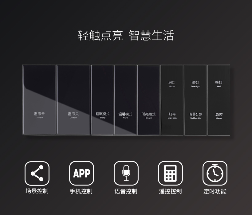 支持刻字;多样化控制操作方式,可手机APP、遥控、场景、语音、定时,适配酒店、别墅、办公场所等风格场景。可搭配全系列普通插座,支持有无网络的状态下自定义场景编辑,实现双控、三控、多控,真正实现用户想自由控制的想法。