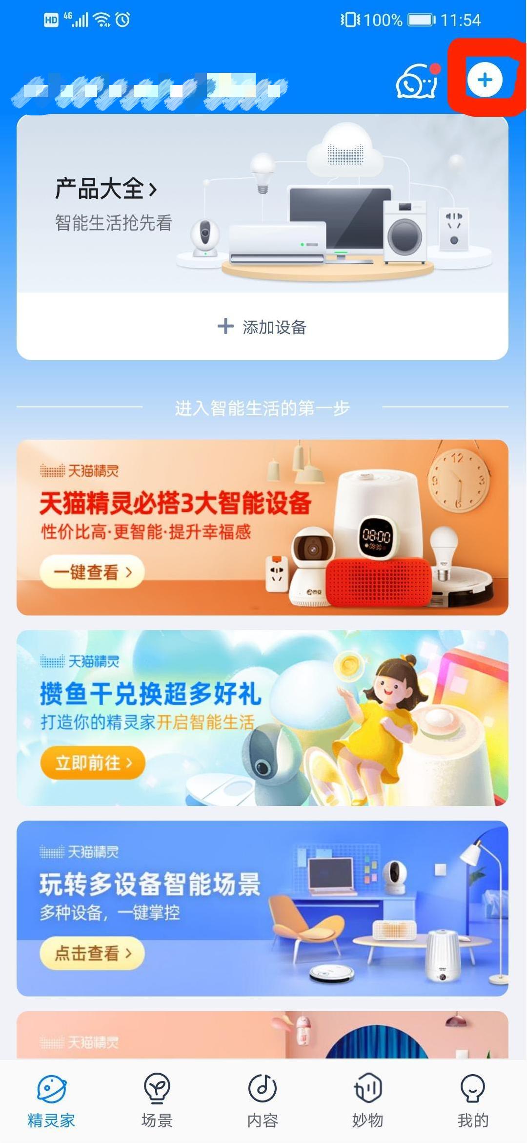 1、打开“天猫精灵”APP,点击下方“精灵家”栏,点击上方“+”;