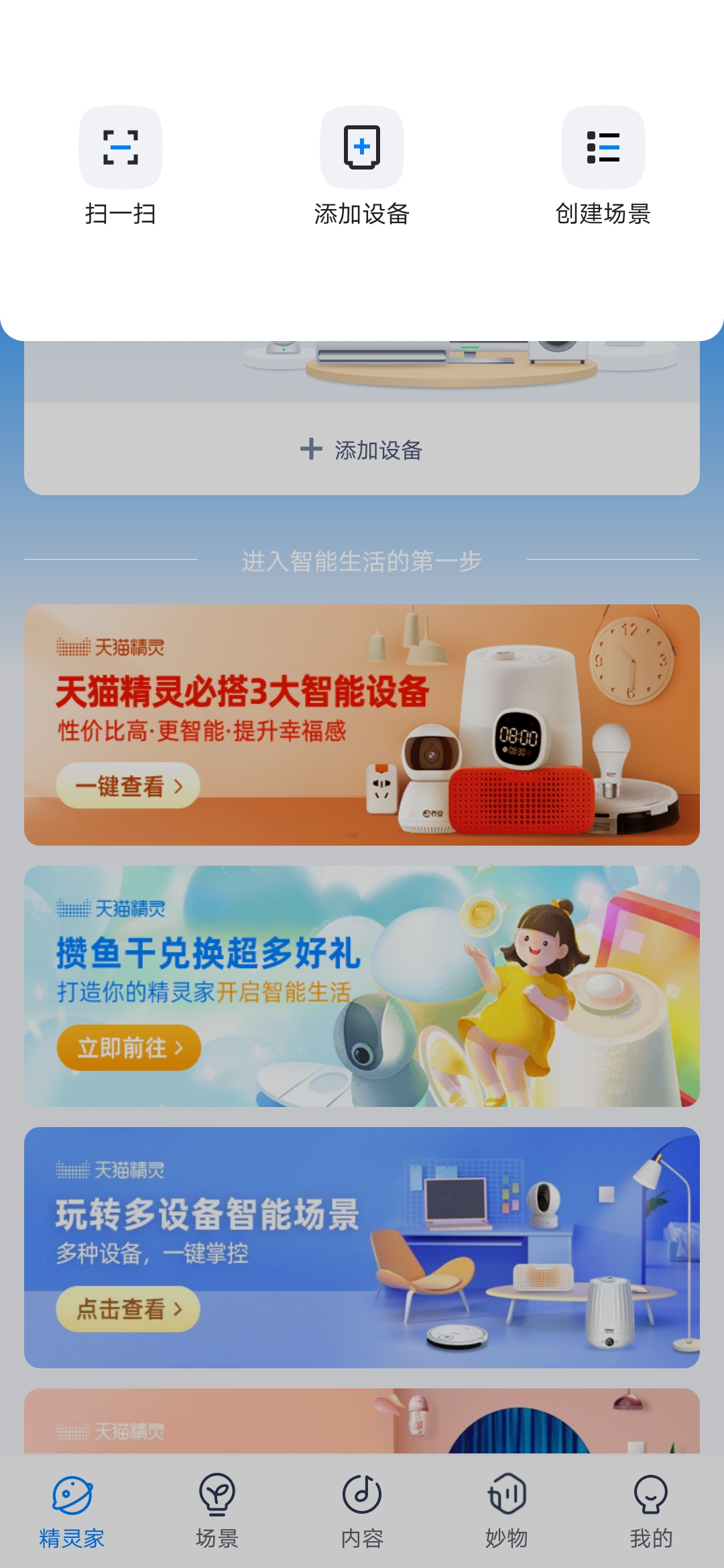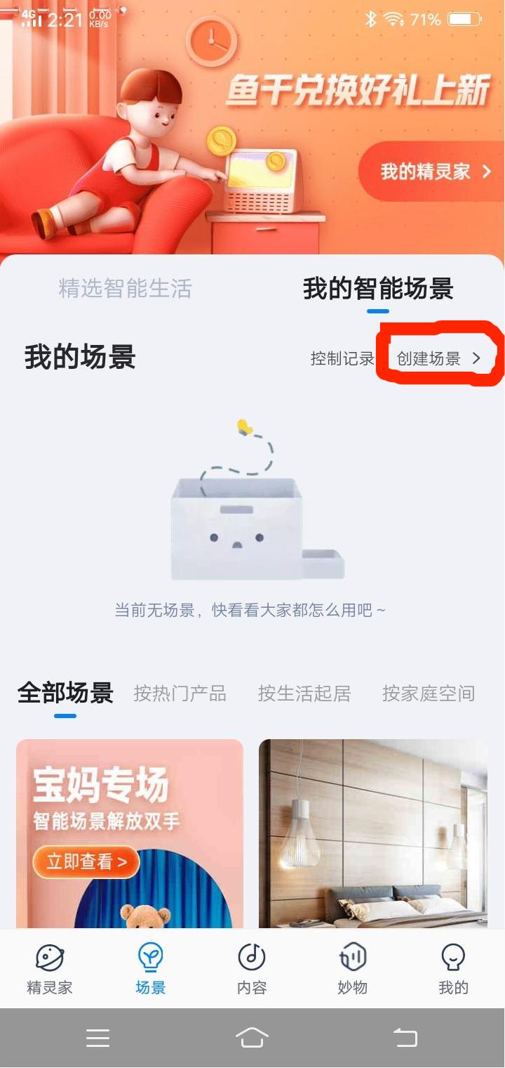 8、用户可在“天猫精灵”APP创建场景。打开“天猫精灵”APP,点击下方“场景”栏,接着点击“创建场景”;