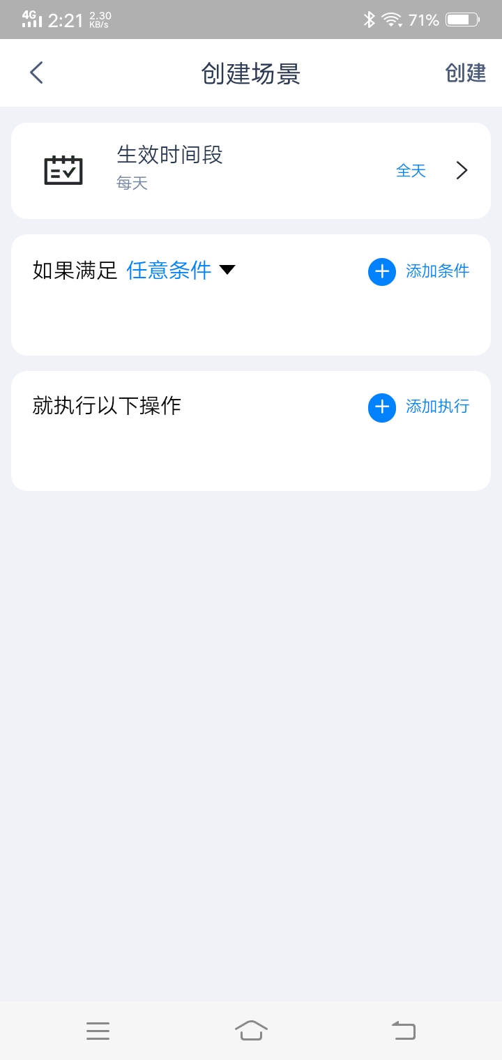 9、进入创建场景页面,需要对“生效时间段”、“添加条件”、“添加执行”进行设定;