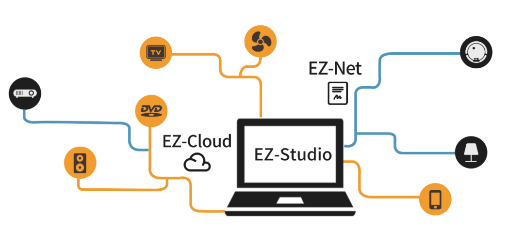 端侧,所有的产品通过EZ-Cloud实现各个设备间互联互通。灯光可以根据不同场景自动调节亮度,传感器监测周围环境,智能联动空调、空气净化器、智能开关、窗帘等其他设备。