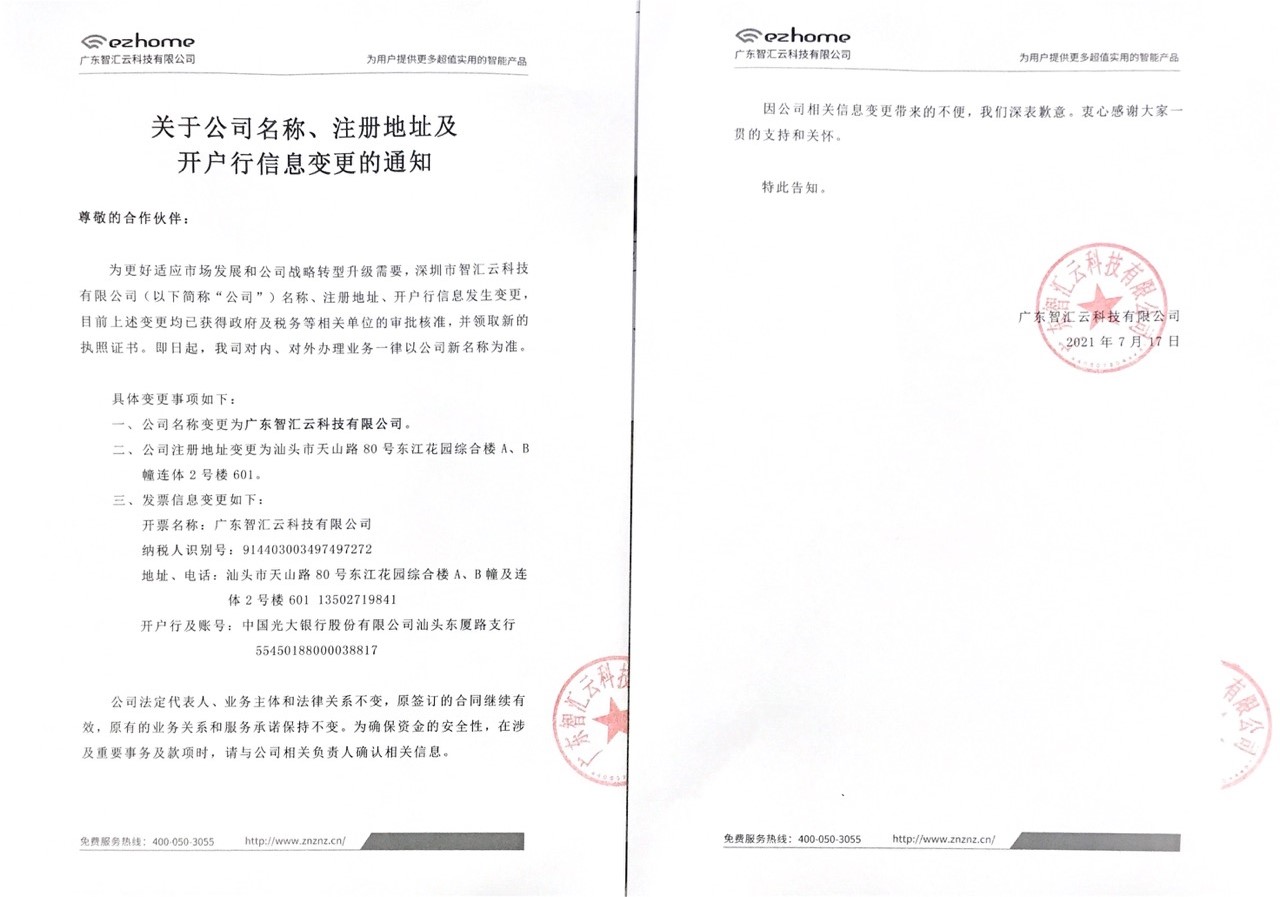 为更好适应市场发展和公司战略转型升级需要,深圳市3499拉斯维加斯科技有限公司(以下简称“公司”)名称、注册地址、开户行信息发生变更,目前上述变更均已获得政府及税务等相关单位的审批核准,并领取新的执照证书。即日起,我司对内、对外办理业务一律以公司新名称为准。