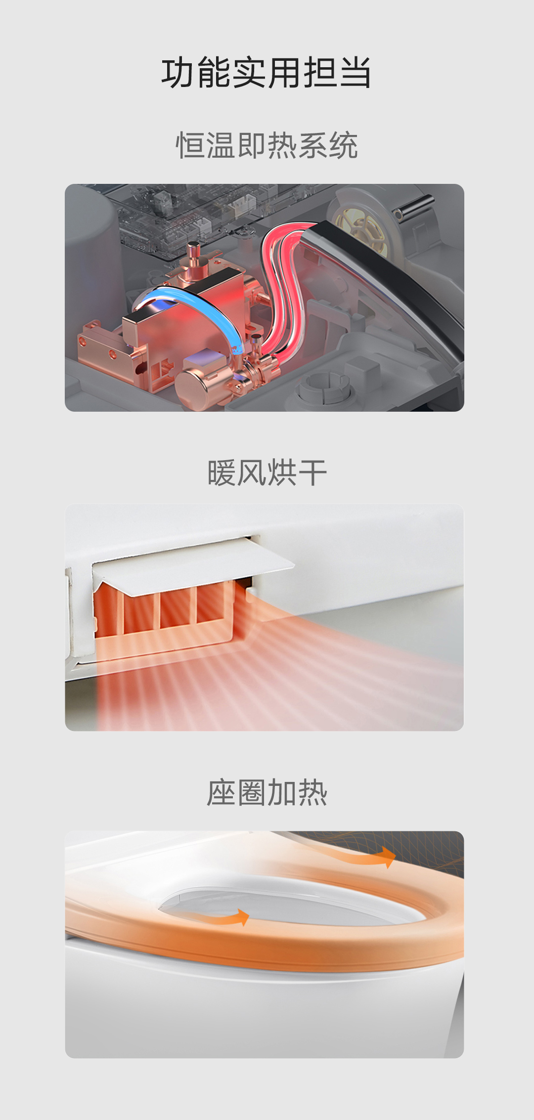 座圈加热,肌肤触感更温和。智能恒温座圈,无惧冰冷,着坐舒适,惬意享受。