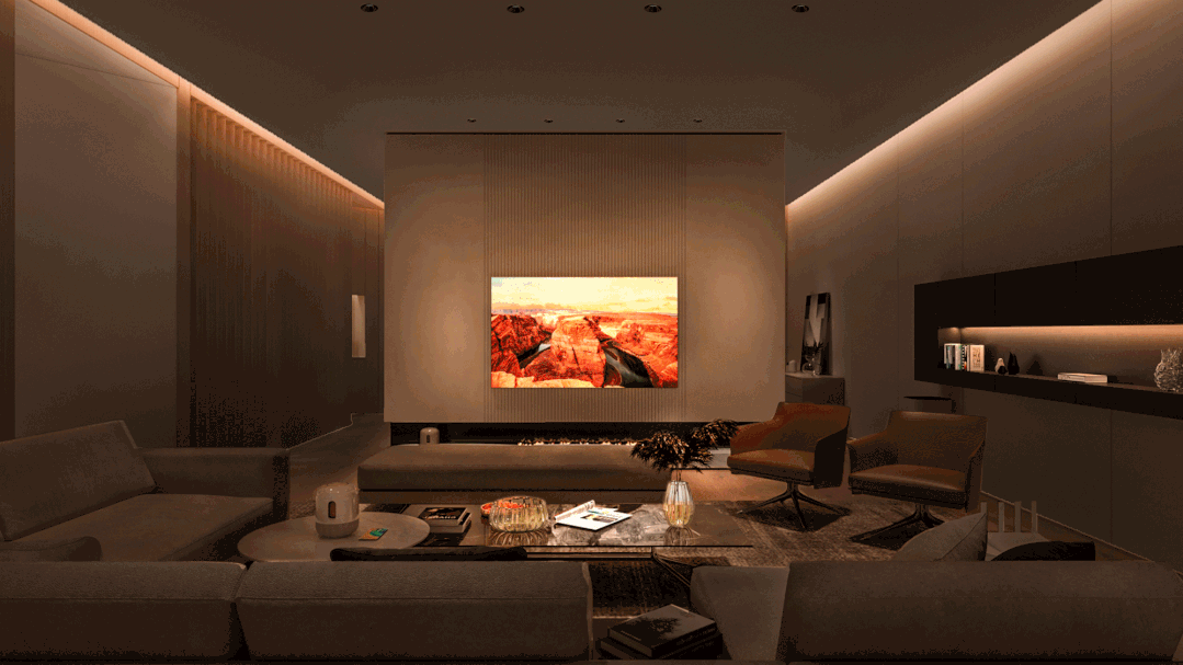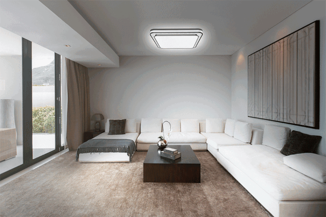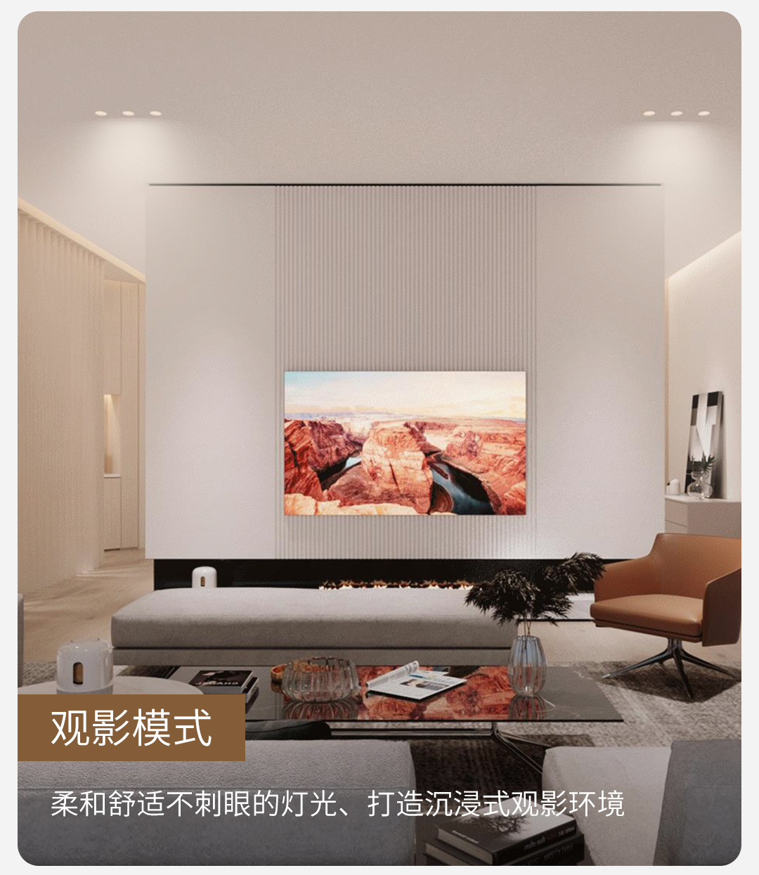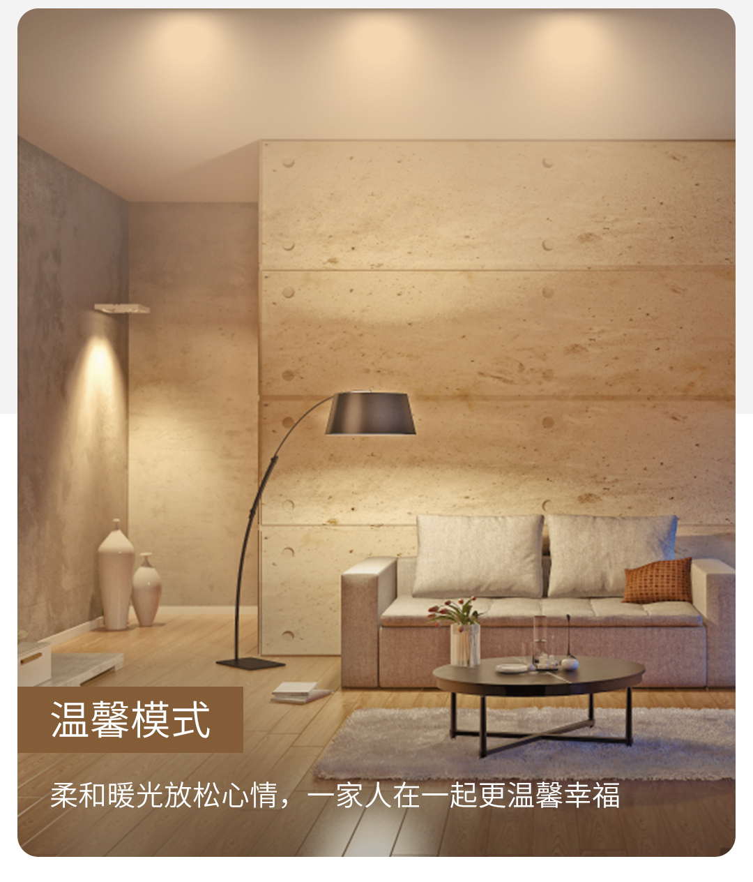 比如观影模式,在客厅看影视娱乐节目时,整个客厅的灯光效果就会自动微弱,慢慢调为3500k-4100K的柔和暖白光,更好地营造出放松浪漫的氛围。