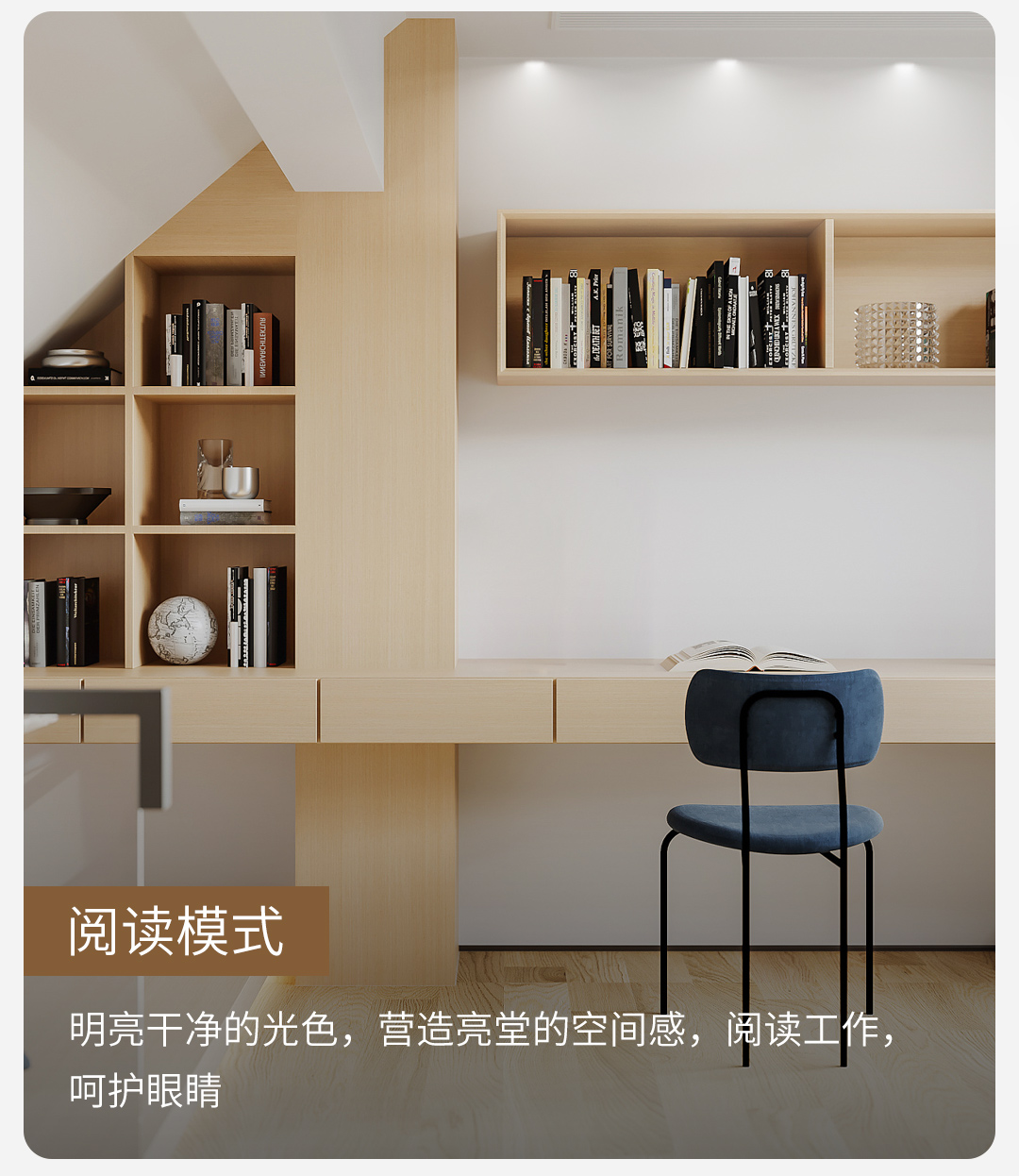 比如阅读模式,选择4000~5500K左右的中调色温能够保持整个空间的清爽和自然,舒适感好,视觉效果非常清晰,并且这样的光线也有助于保护视力,减少蓝光危害。