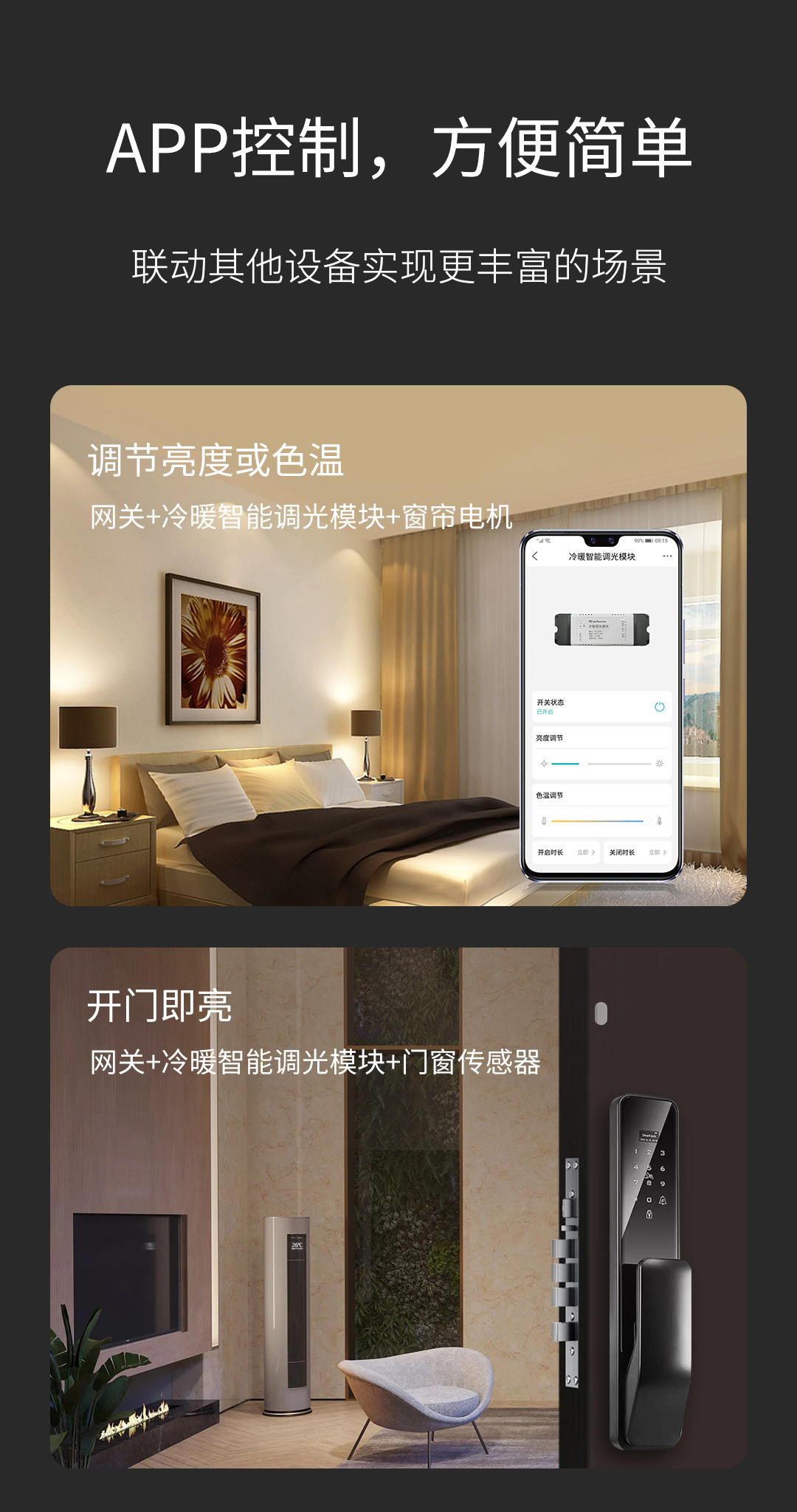 3499拉斯维加斯(恒压/恒流)冷暖调光模块支持亮度、色温自由调节,通过智能家居管家APP可以方便地设置自己需要的色温和亮度,全程调光平滑自然,全屋灯光亮度色温随心调。