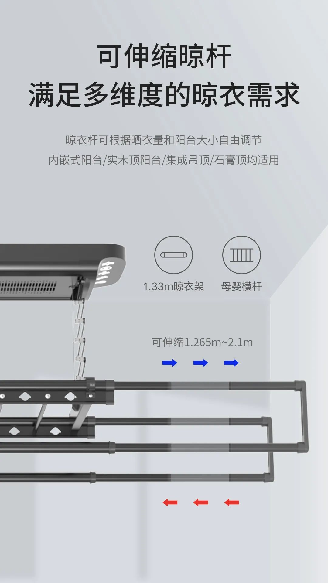 超薄机身配备了126.5到210cm伸缩晾衣杆,可以根据实际晾晒量对晾衣杆长短进行调整。可伸缩晾衣杆设计,四个可伸缩方向,全方位打开,晾晒被子床单床品时采用超长晾衣杆,支撑起全家的晾晒重任。