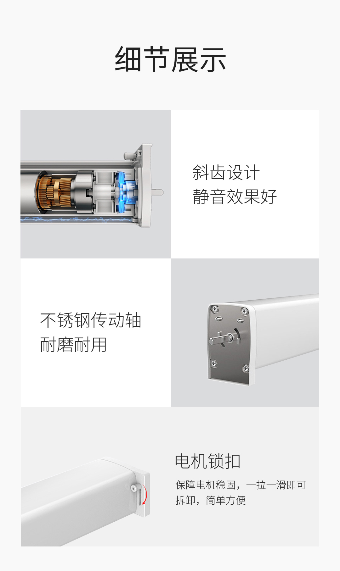 标配高性能马达,品质稳定;承重性能优越,可轻松拉动50KG以内的厚重窗帘;斜齿超静音结构设计,搭配直流电机驱动,运行更安静顺滑;独特的扭力输出结构设计,减少震动,增加静音效果,隔音降噪达33dB以下,营造出良好的居家环境。