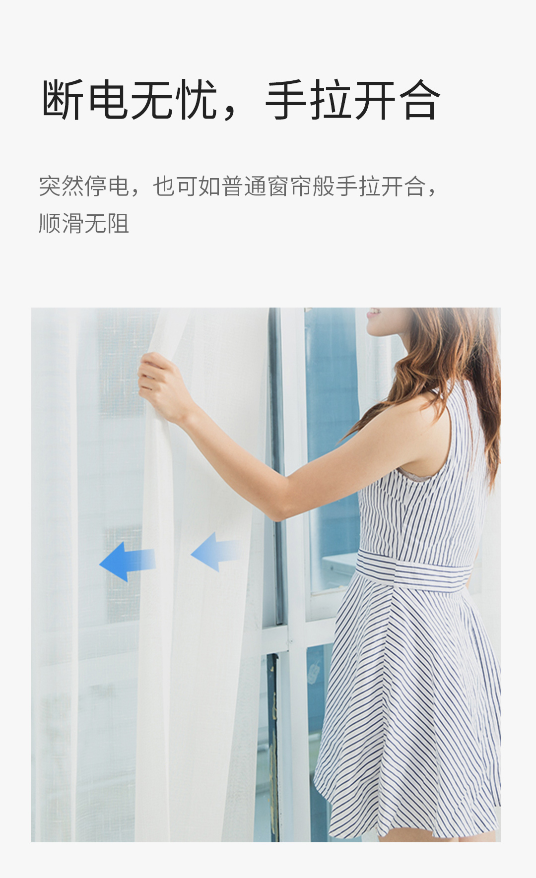 当断电或者是停电时,依旧可以通过手动的方式,进行窗帘开合的操作,顺滑无阻碍。