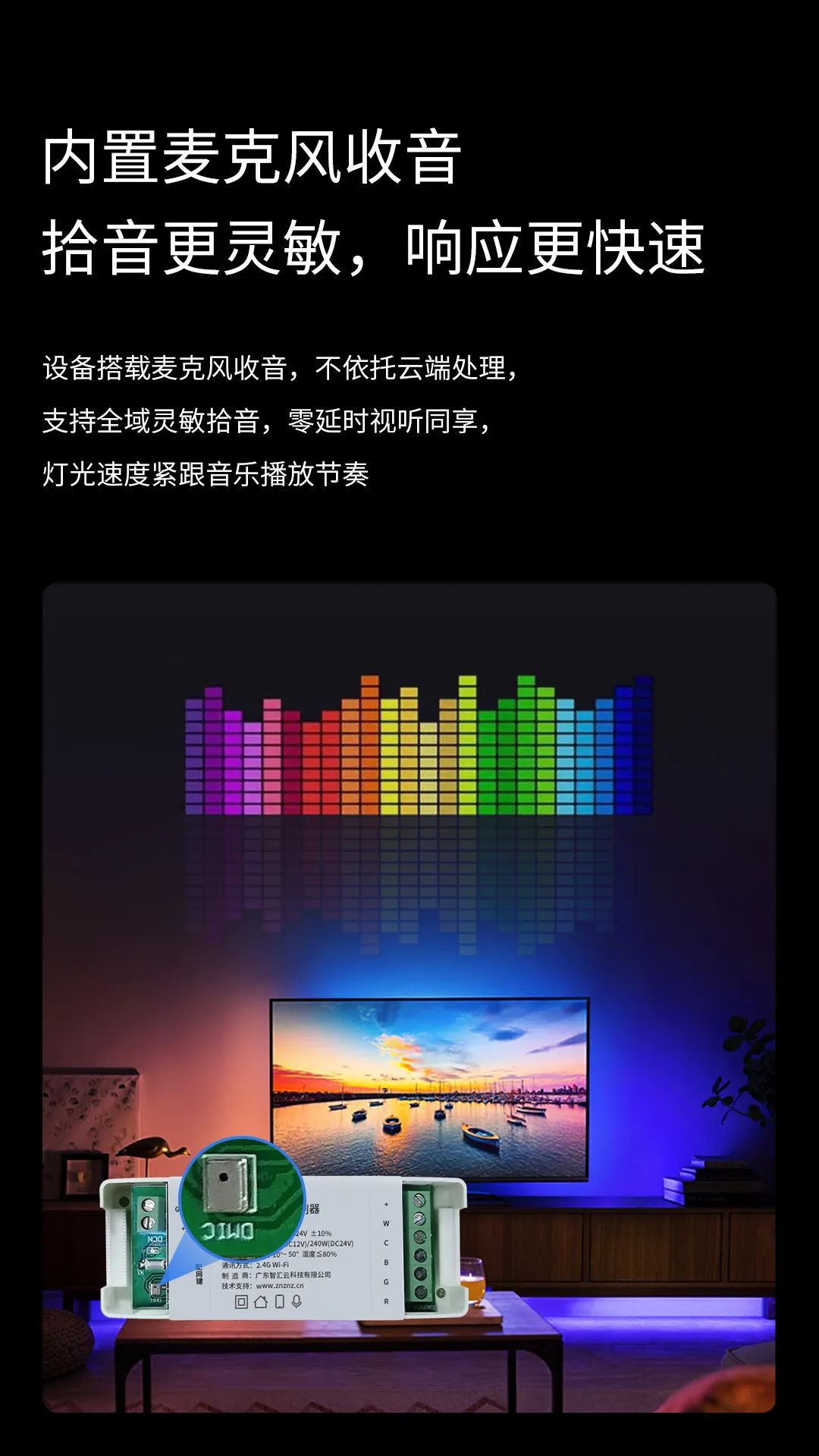 区别于市面上大部分通过手机话筒拾音的调光控制器,控制器内置微型麦克风拾音,精准识别音乐的变化而发出指令,使灯带随着音乐的律动变换色彩。