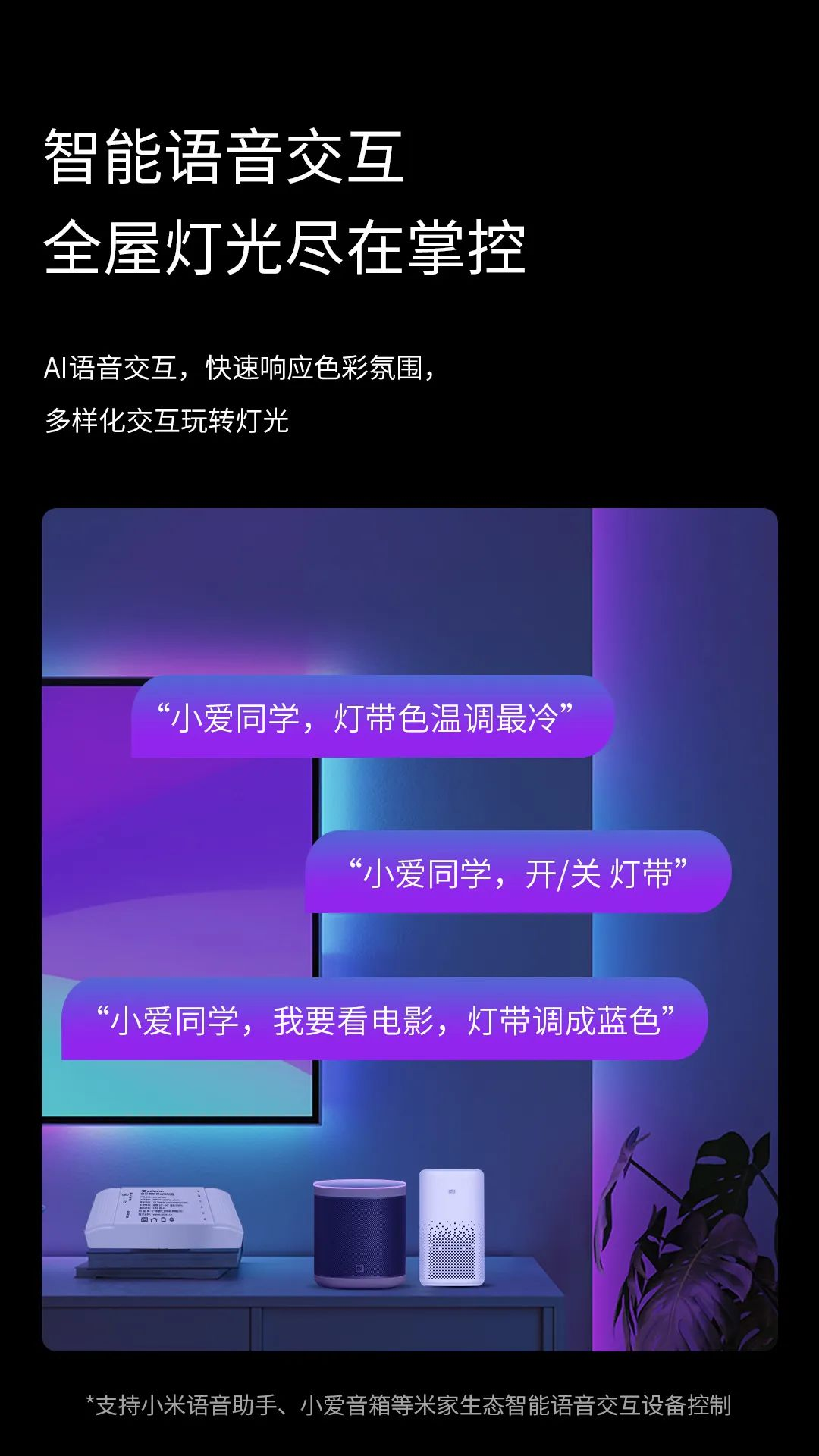 支持小爱语音助手、小米AI智能音箱语音控制,从此开关灯只是一句话的事儿,就能懒洋洋地享受智能带来的便利。