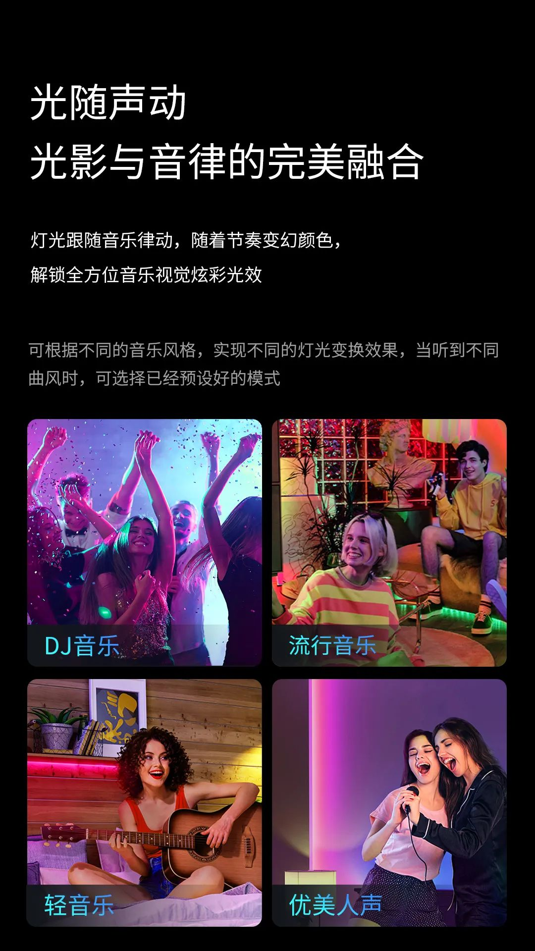 除了音乐律动、冷暖模式、彩光模式三种功能模式,新品还加入了多种预设情景模式,让灯光读懂你的心情。