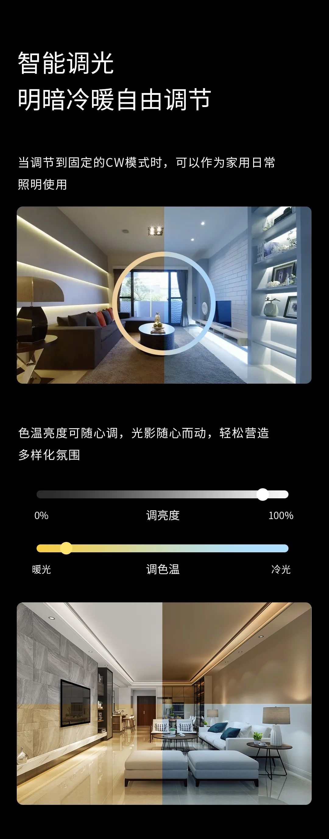当切换到冷暖模式时,用户可以对灯光的亮度和色温进行精确的自由调节。从落日余晖到盛夏晴空,根据自己的生活习惯打造个性化灯光场景。
