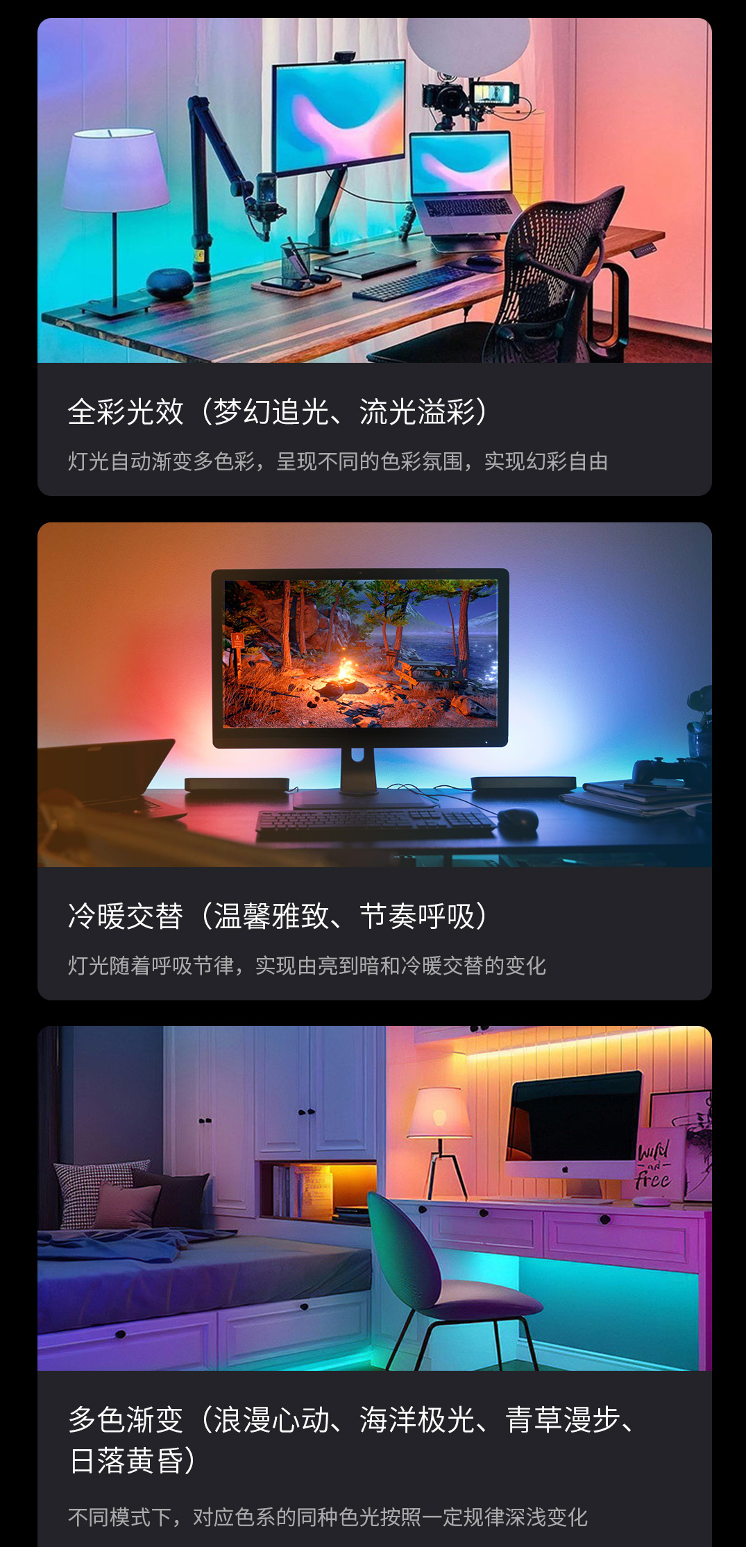 APP还预设有多种光效模式,适配各种不同的场景,一键切换不同的灯光风格效果。