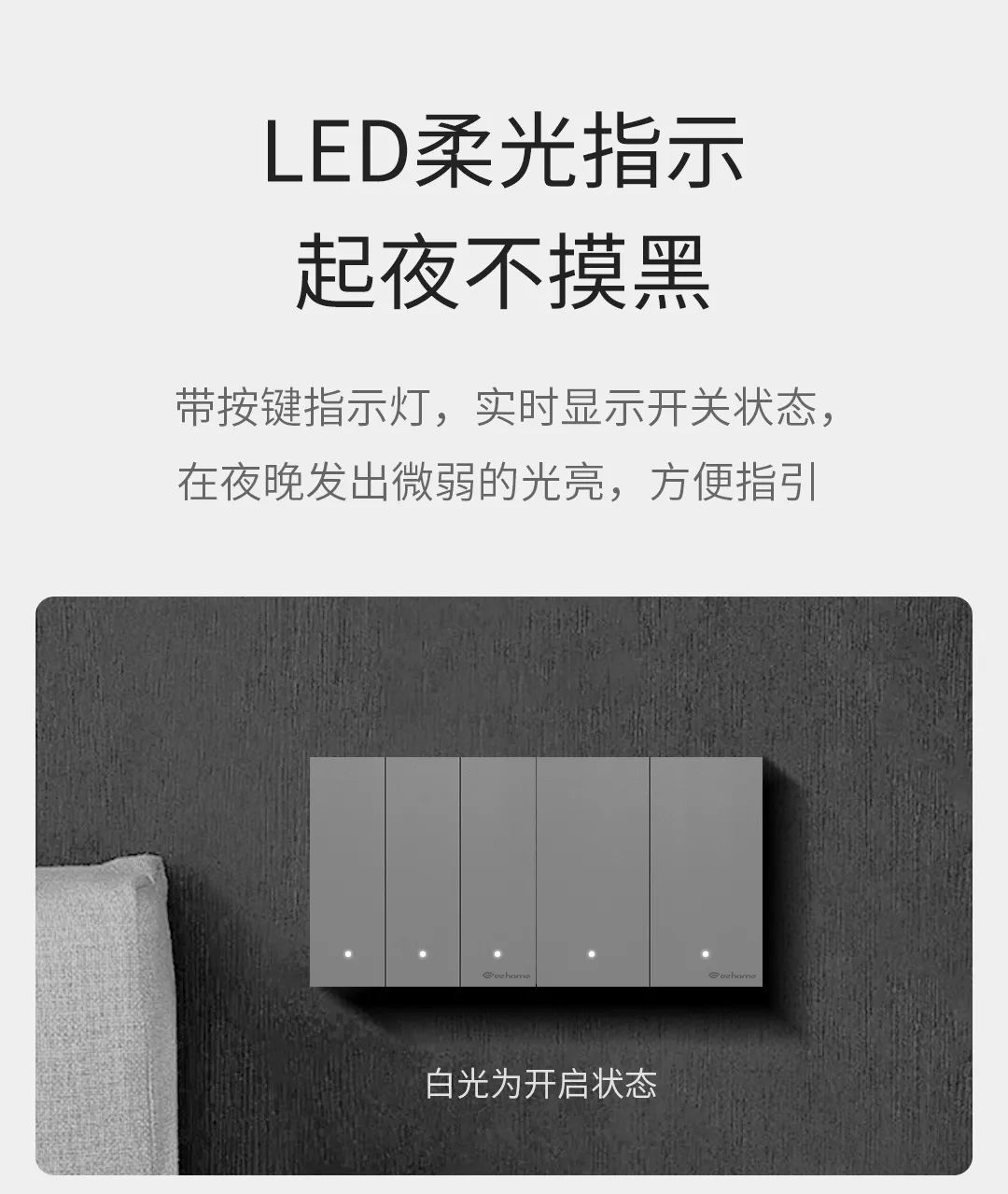 关灯后,在黑暗中幽然散发暖黄柔光指示,夜晚开关位置一目了然。通过手机APP可单独关闭面板状态指示灯,保证灯光不会影响睡眠质量。
