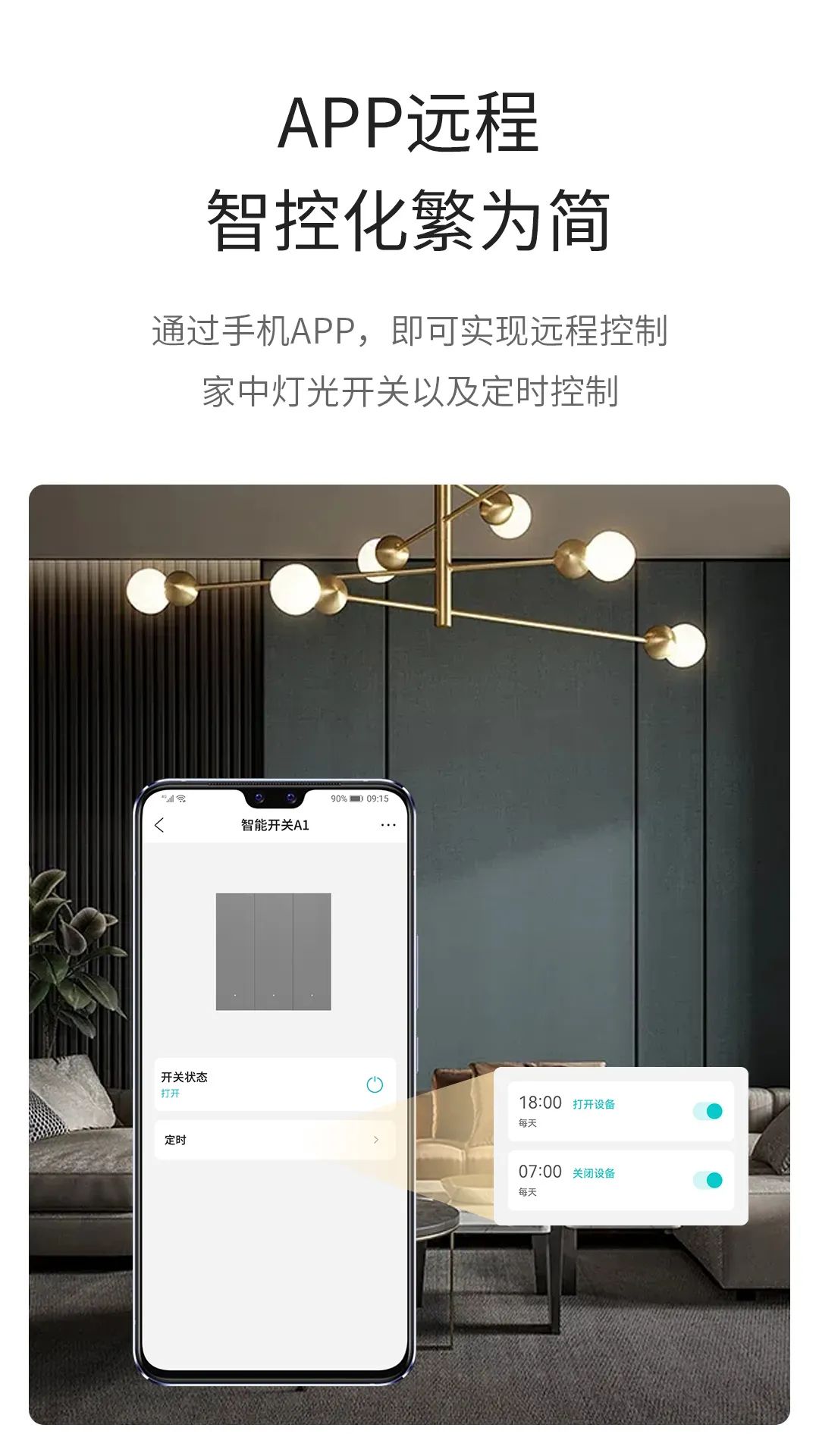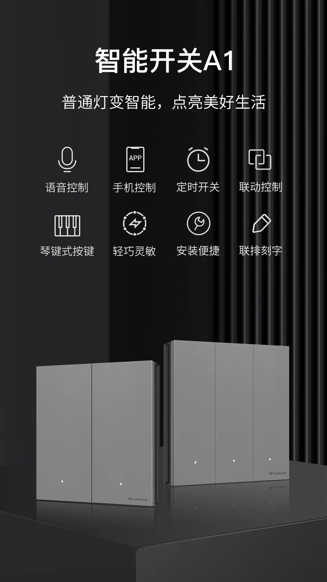 智能开关A1具备手机APP控制、语音控制、场景编辑、智能联动、定时开关等多种控制功能。