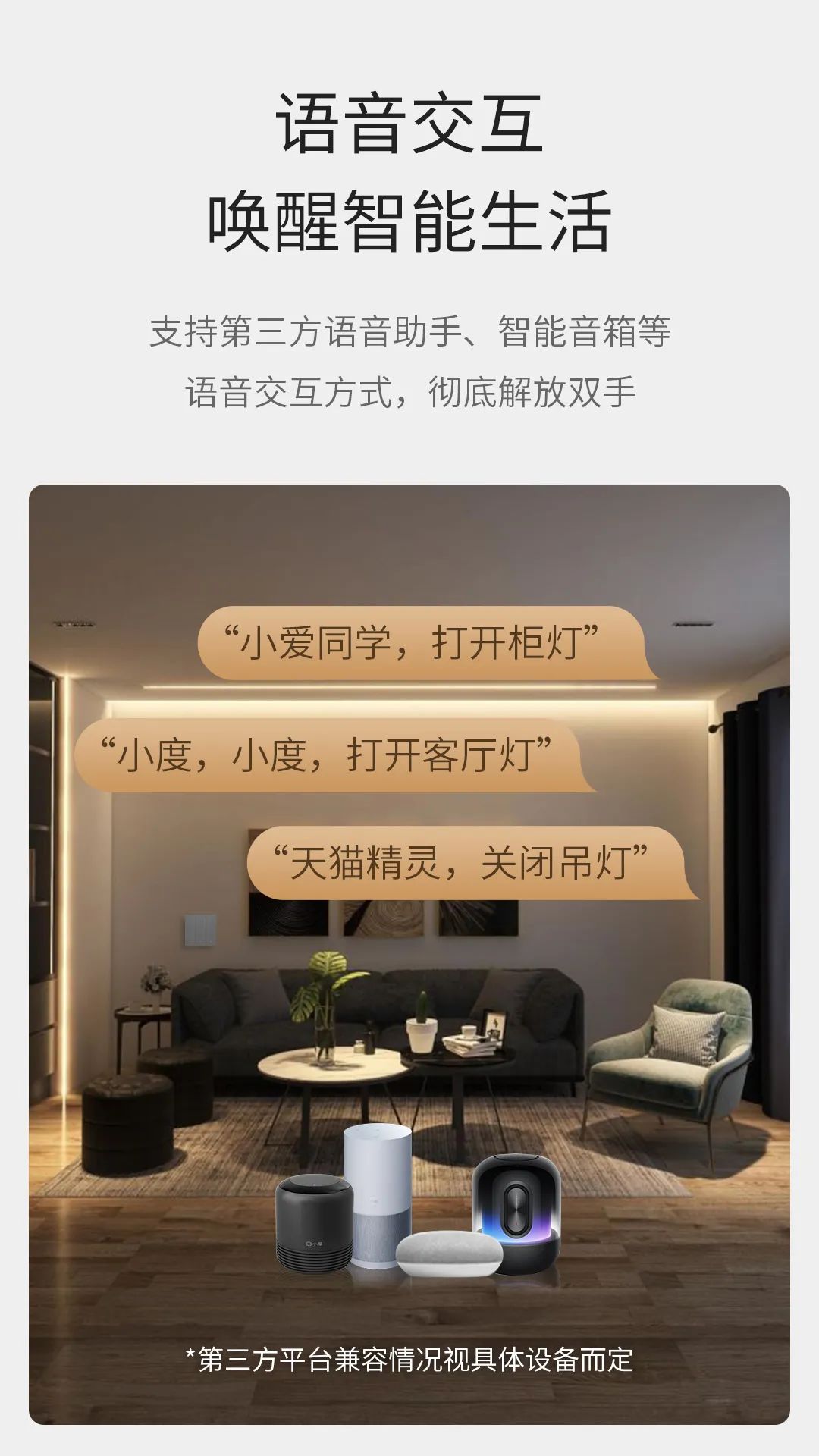 语音控制:连接第三方语音助手服务,比如说小艺、小爱同学、天猫精灵、小度等等,对家中灯光进行语音智控,动动嘴就能开关全屋灯光、切换不同照明模式和联动场景。