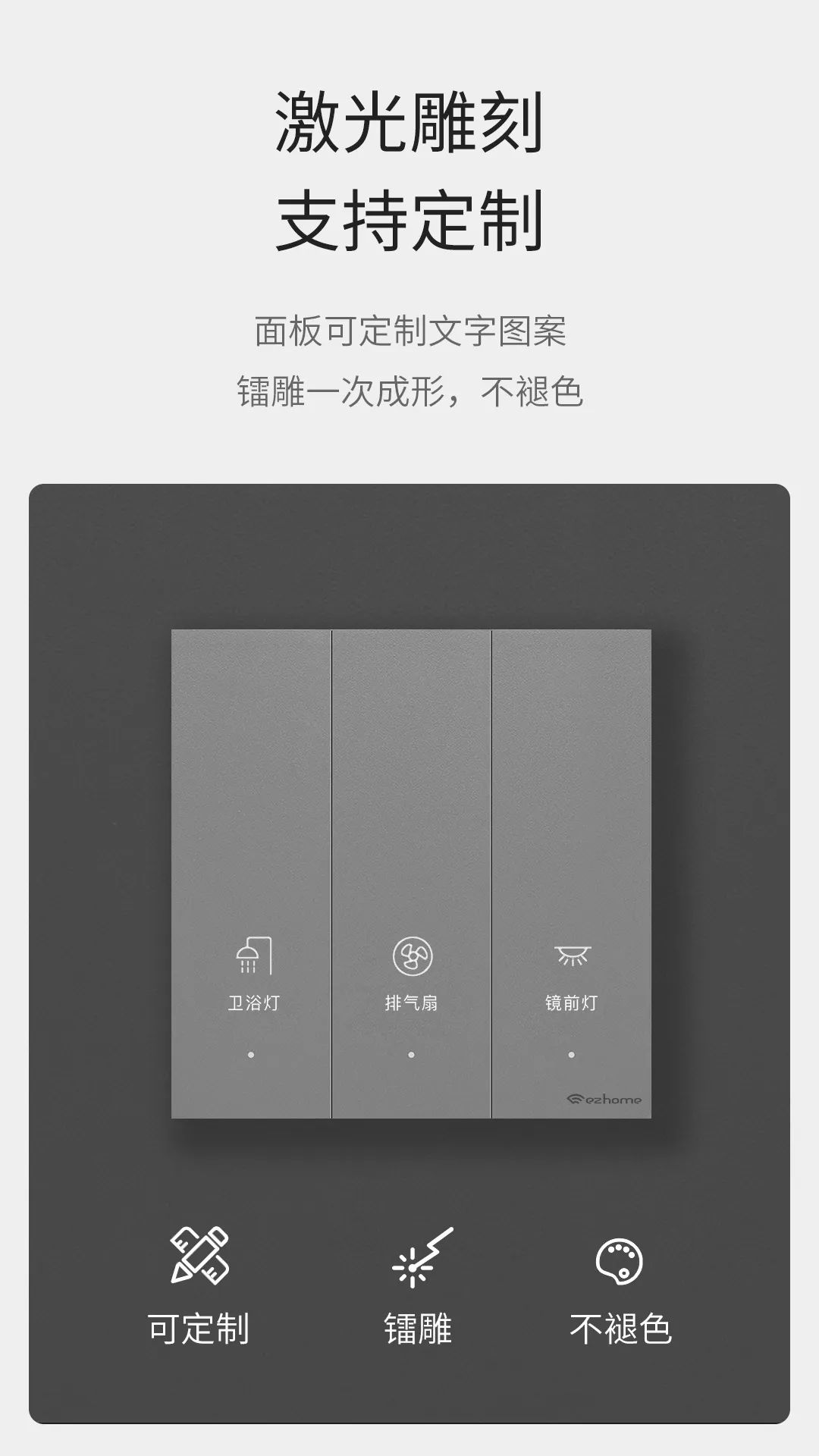 多联面板随心定义、选择丰富,墙面整洁简练,赏心悦目。支持个性化定制刻字,告别千篇一律,为家创造无限可能。