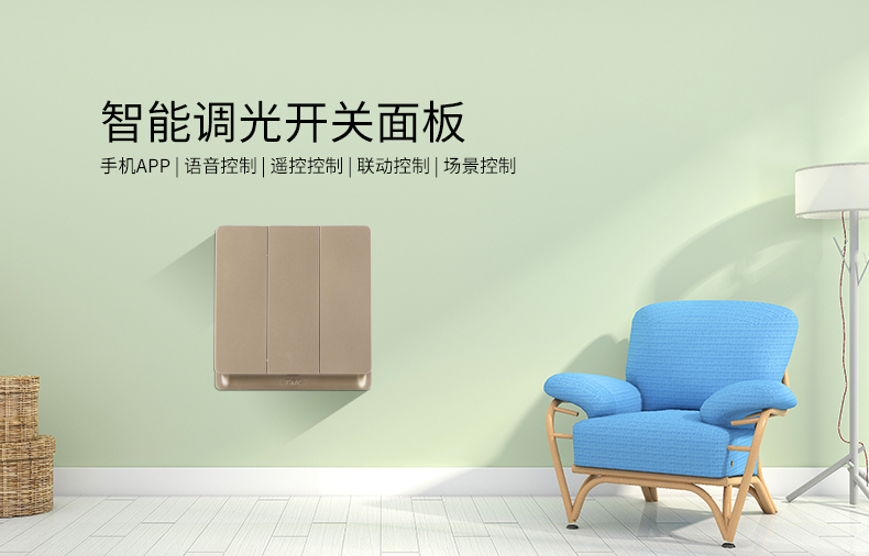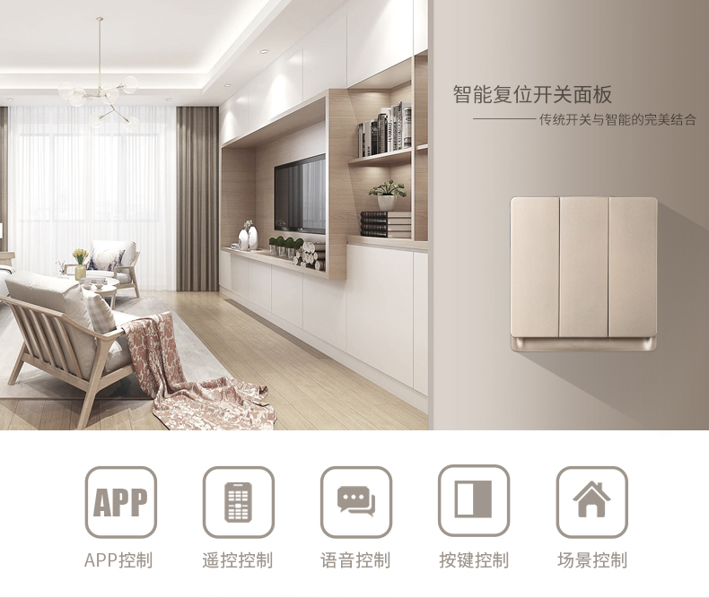 智能复位开关面板、智能触控面板,保留传统按键模式控制,更增加多种控制方式,语音、手机APP,场景触发,遥控控制,一个开关面板,足可控制多个房间灯光状态。