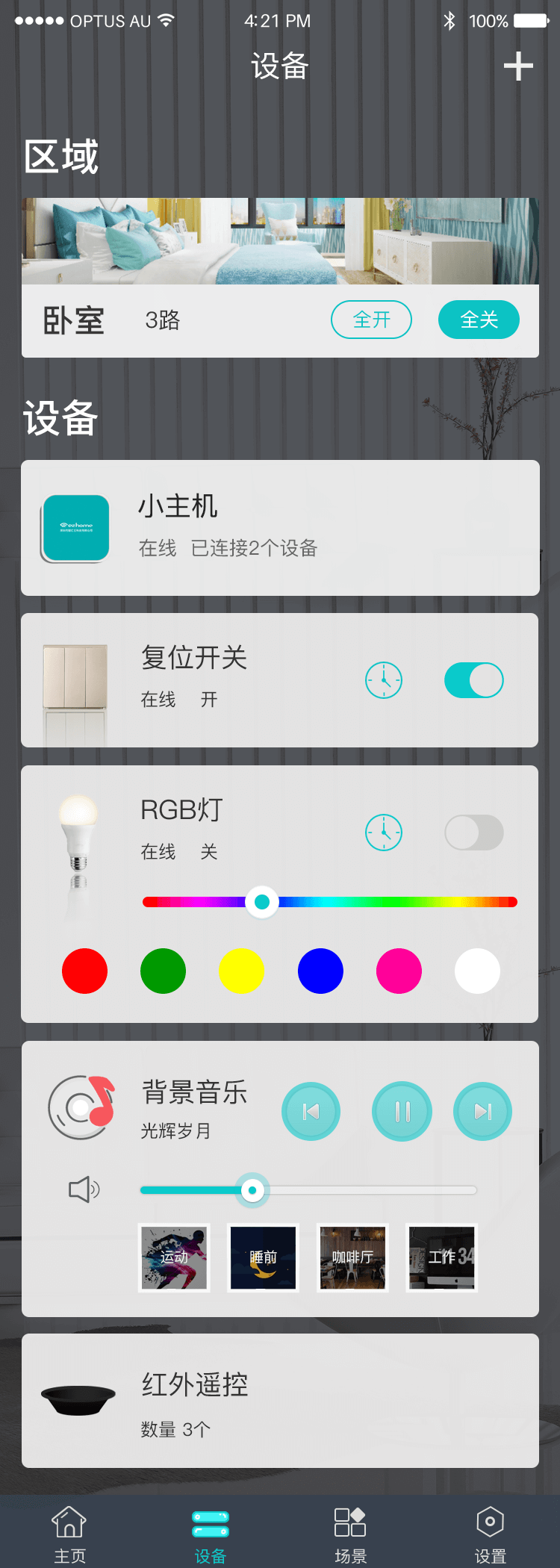 可实现手机APP对背景音乐主机播放音乐、音量大小及音乐类型的操作,还能将家中已设定好的智能设备、场景模式同步到背景音乐主机上。
