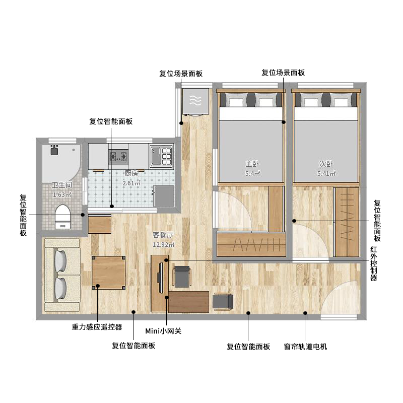 另外,还可根据不同房间的功能需求,适当增加硬件配置,来优化智能家居解决方案。如安装智能门锁智能推窗器智能传感器智能插座等设备。