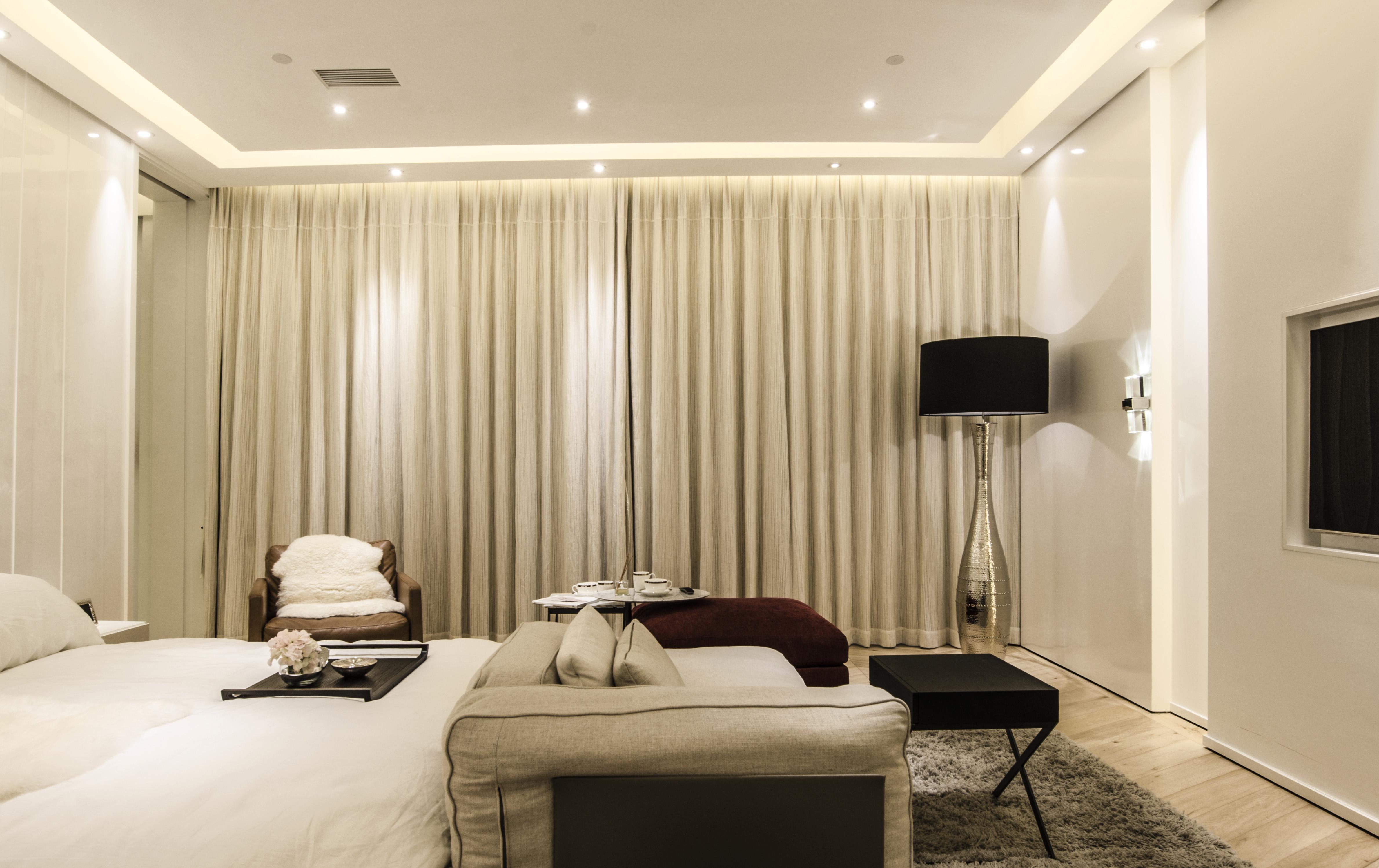 智能窗帘(包括3m窗帘轨道1条,内置窗帘电机1):于客厅处安装,实现手机、遥控、语音、手拉和场景联动等方式控制。