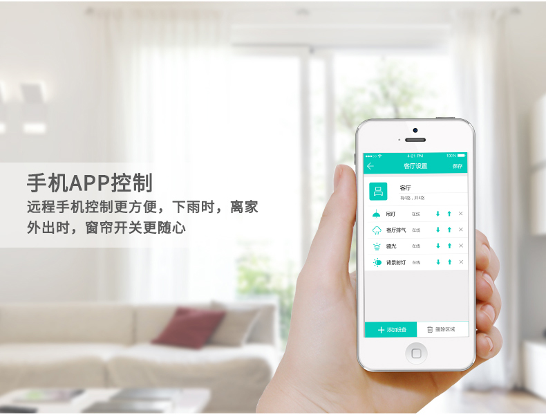 当屋外阳光灿烂,智能窗帘系统也可以跟随传感器一同工作,拉开窗帘的动作,保证家中采光;我们也可以通过手机APP、或是场景联动对窗帘实现智能控制;晚上睡觉,按下场景面板按键,关闭家中所有灯光及家电设备,窗帘也缓缓拉上。智能产品间的联动,为您打造舒适惬意的生活状态。