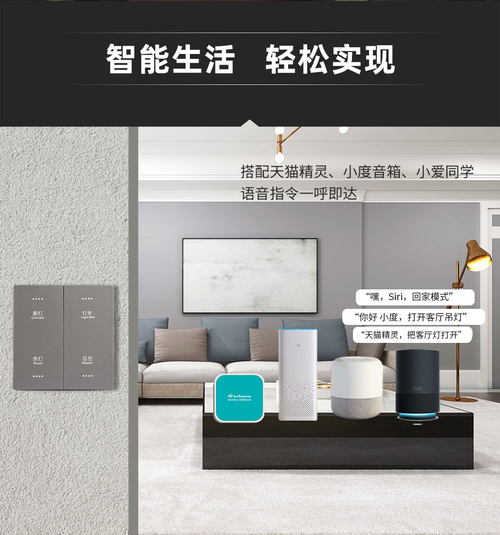 语音控制:可搭配三大主流品牌智能语控设备,轻松实现语音控制;也支持苹果系统“Siri”语音指令实现场景模式控制。