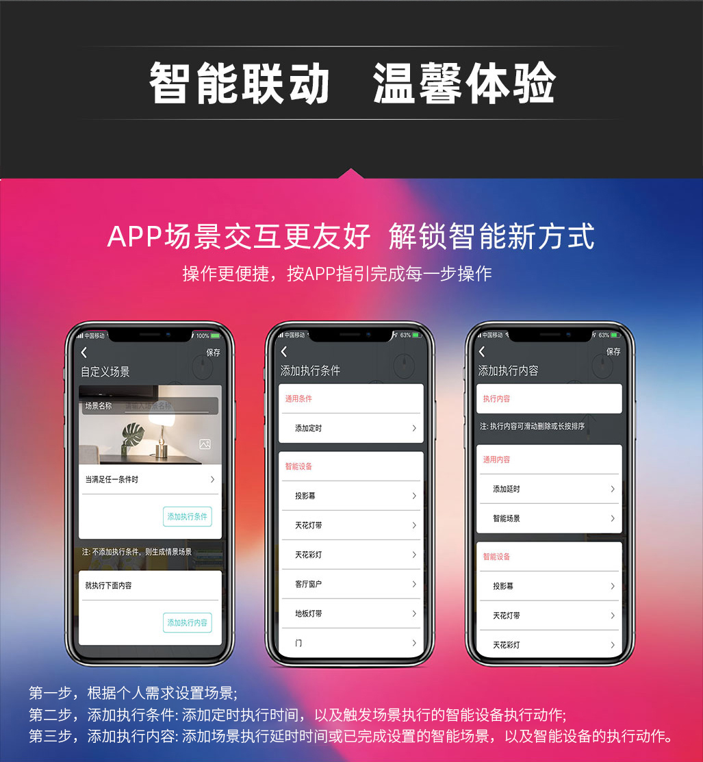 仅需按照APP指引,逐步完成场景模式编辑,三步达成智能场景联动。