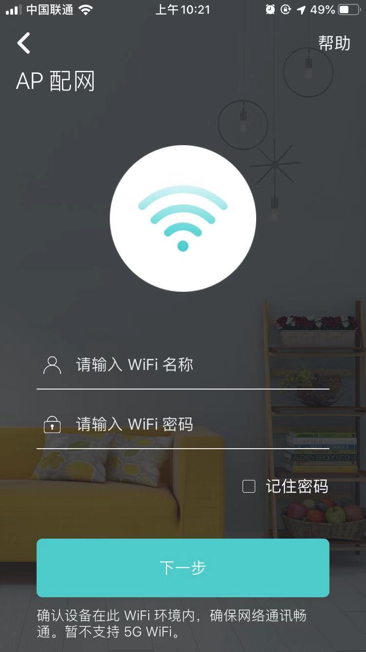 进入AP配网界面后,对应输入所需连接WIFI名称和密码;点击下一步开启配网模式。(注意:门锁暂不支持5G频段WIFI)
