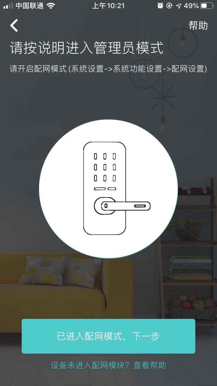 若弹框显示WIFI环境错误消息时,需先确保智能门锁已在开启状态,并将手机跳转至WIFI选择界面,选择对应弹框消息中对应WIFI,即可继续进行AP配网,等待配网完成点击下一步。