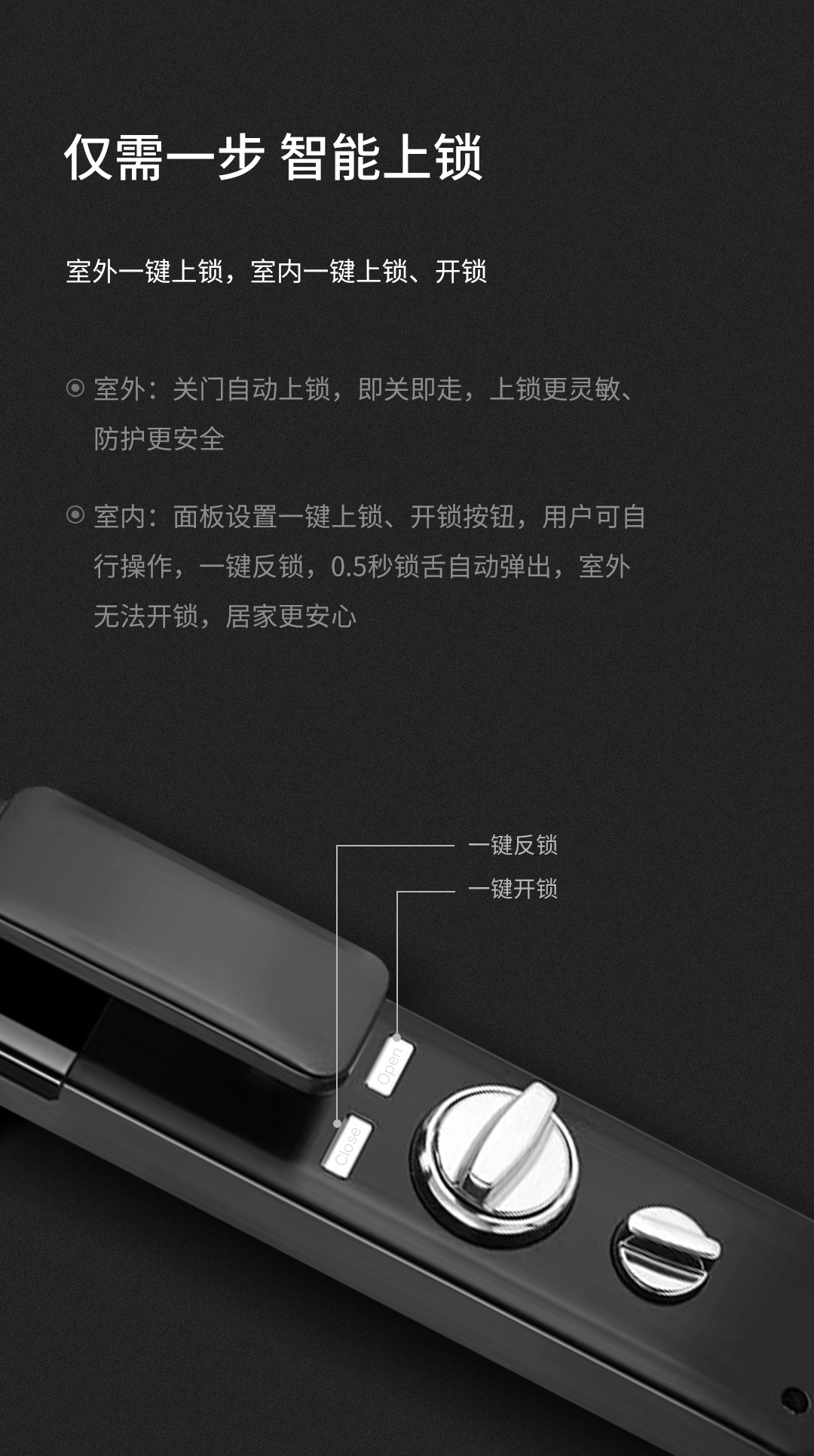 按键下方还设有“反锁旋钮”室内独立反锁,对于独居在家的女性或者家里有小孩老人的家庭,不仅可以保障安全,也可以保护隐私。