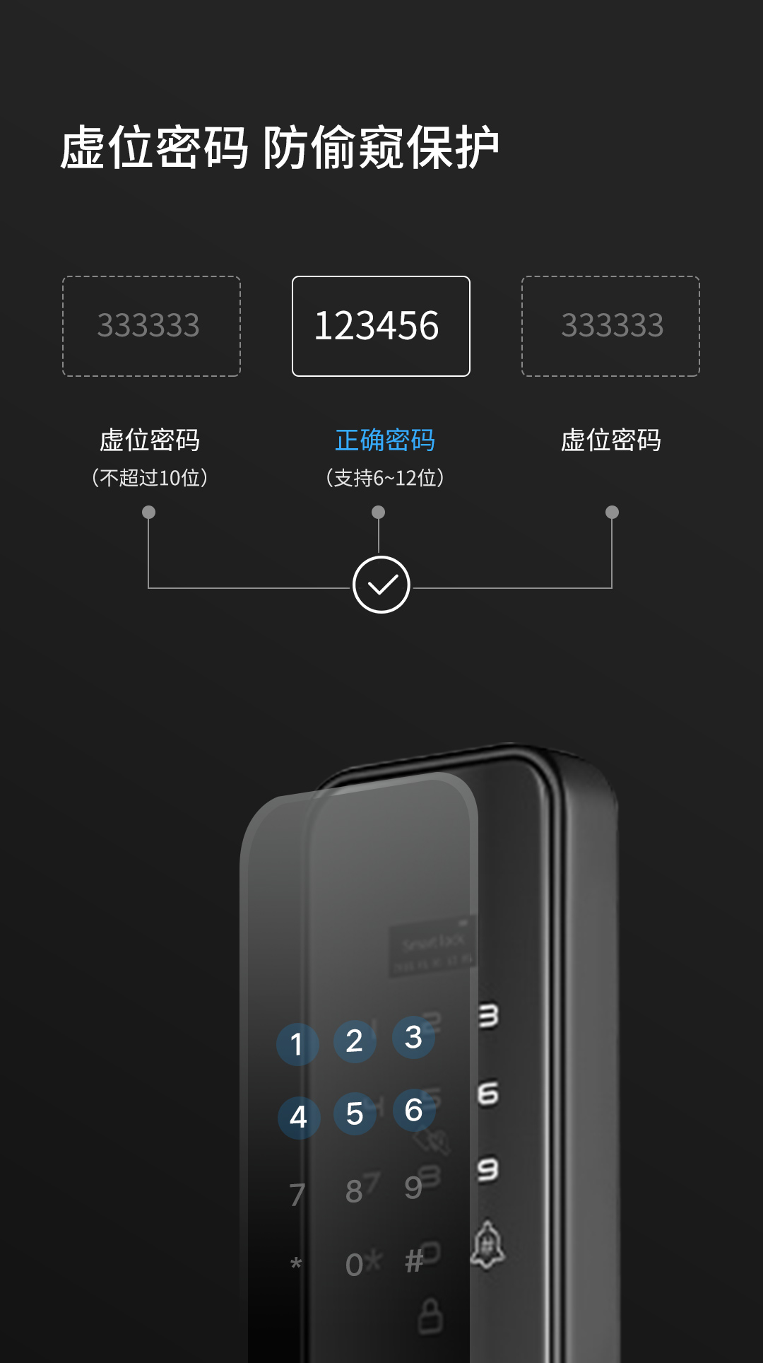 为了防止入门解锁时被窥屏泄漏密码,A16使用了虚位密码技术,在正确的密码前面和后面加上任意位数的数字,只要中间有连续正确的密码就可开门,从此输密码不再遮遮掩掩,大方解锁开门也安全。