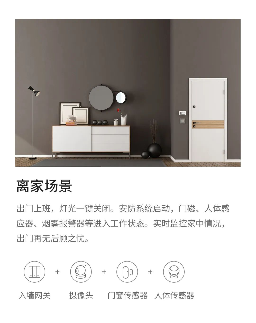 出门的时候,家里全部照明陆续关闭,空调、电视、热水器自动关闭,窗帘拉开,安防布防。方便的同时,安全保护你的家庭。